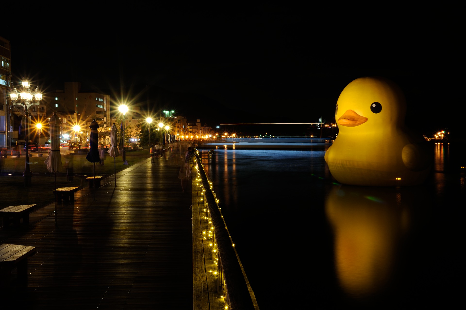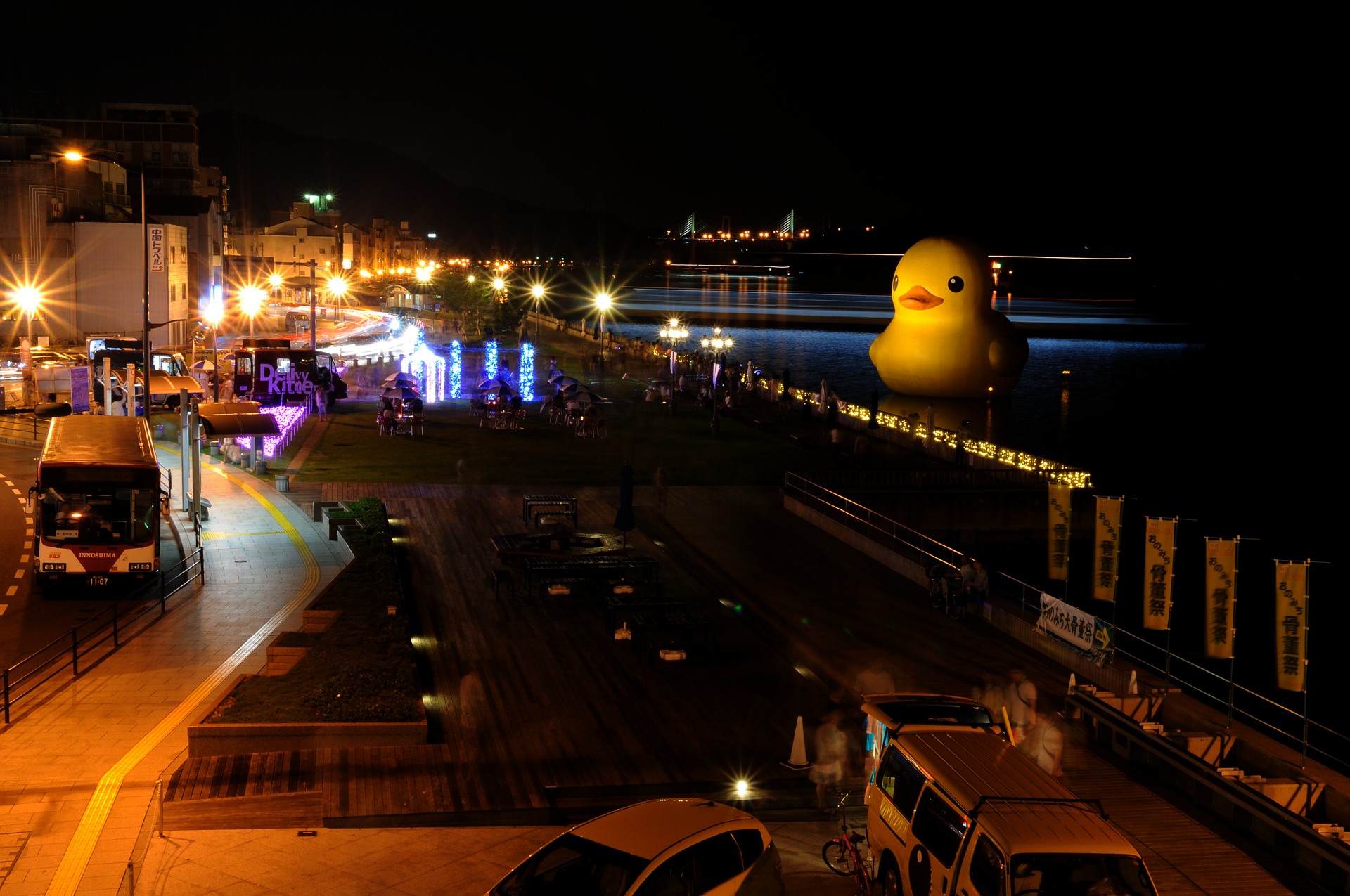 国内で海に浮かべられたのは今回が初めてで、夜間はライトアップされる。