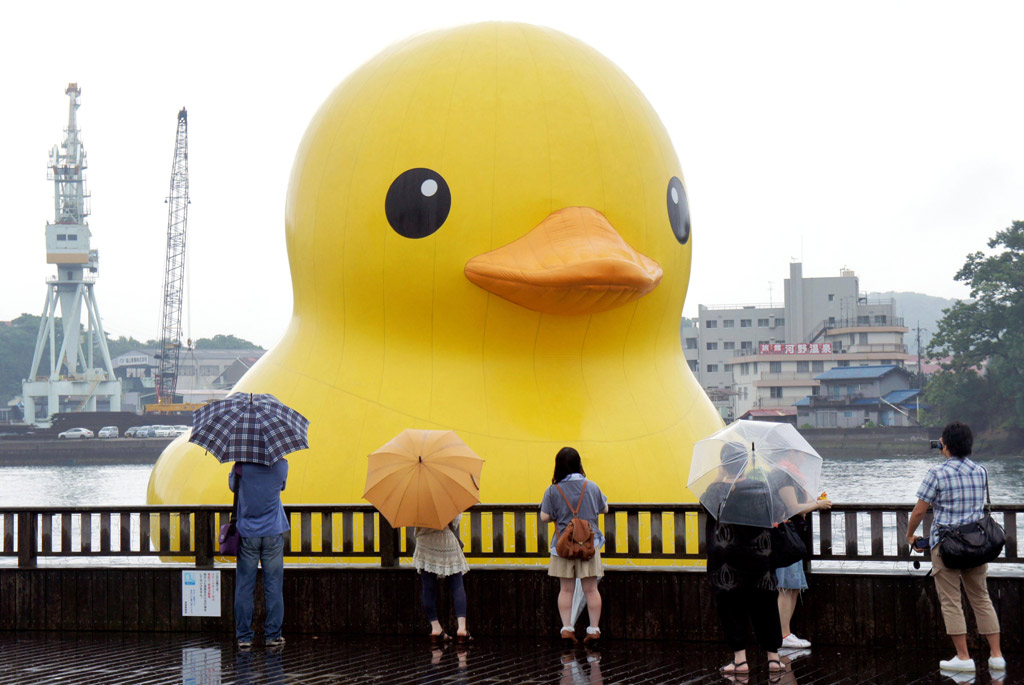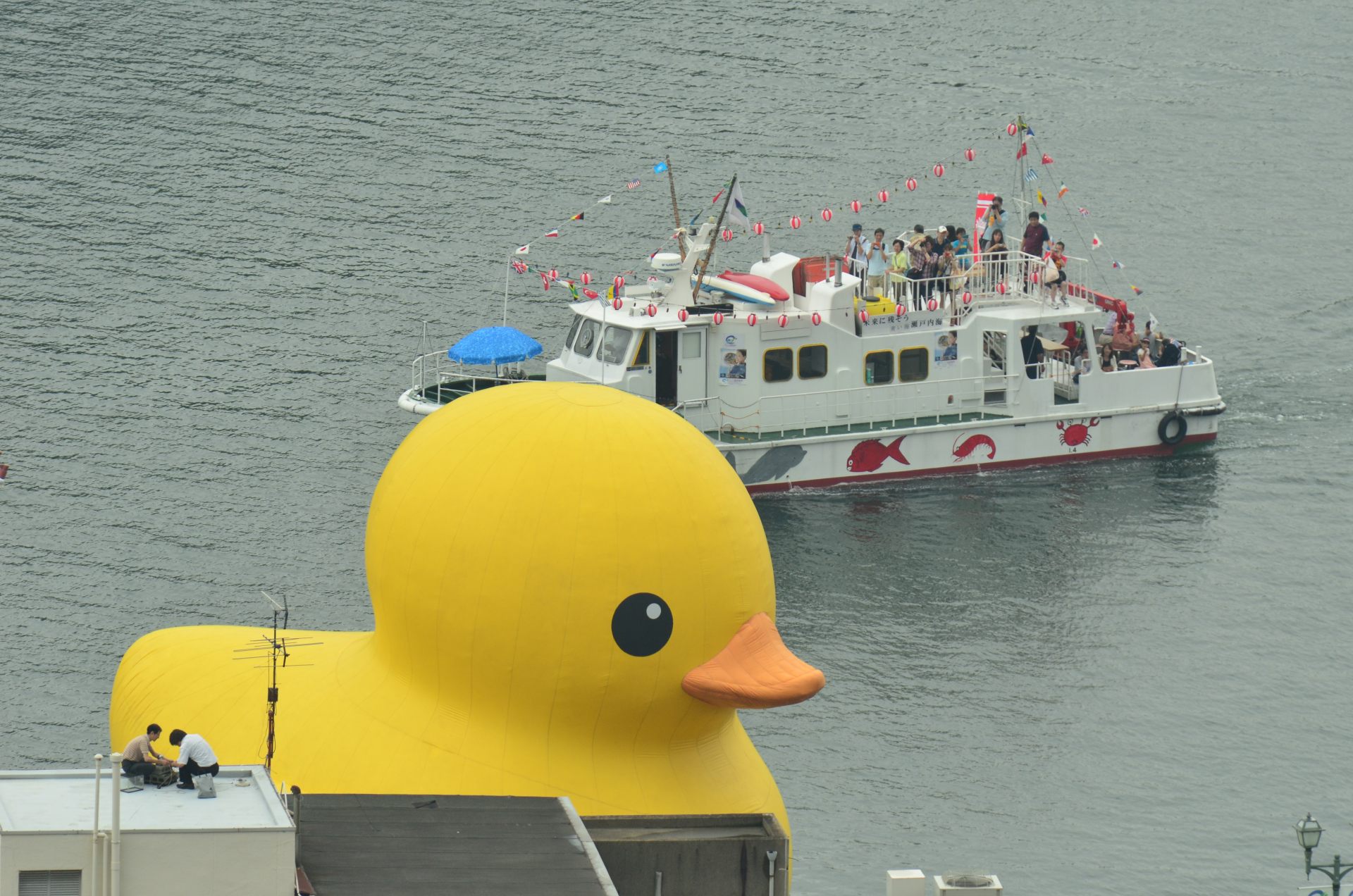 広島県尾道市の瀬戸内海に14日、巨大なアヒルのオブジェ「ラバー・ダック」(ゴム製、 長さ11メートル、幅、高さ各9・5メートル)が浮かべられ、大勢の市民が見物に訪れた。イベント「海フェスタおのみち」(実行委主催)のシンボルアートとして29日まで海上展示される。