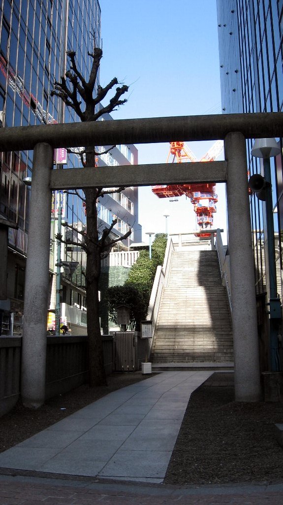 ビルの谷間の階段を上がると、白壁のまぶしい社殿が