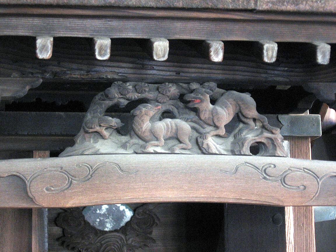 覆い堂の中に鎮座する、本殿の前面の蛙股部分に彫られた狼の姿。