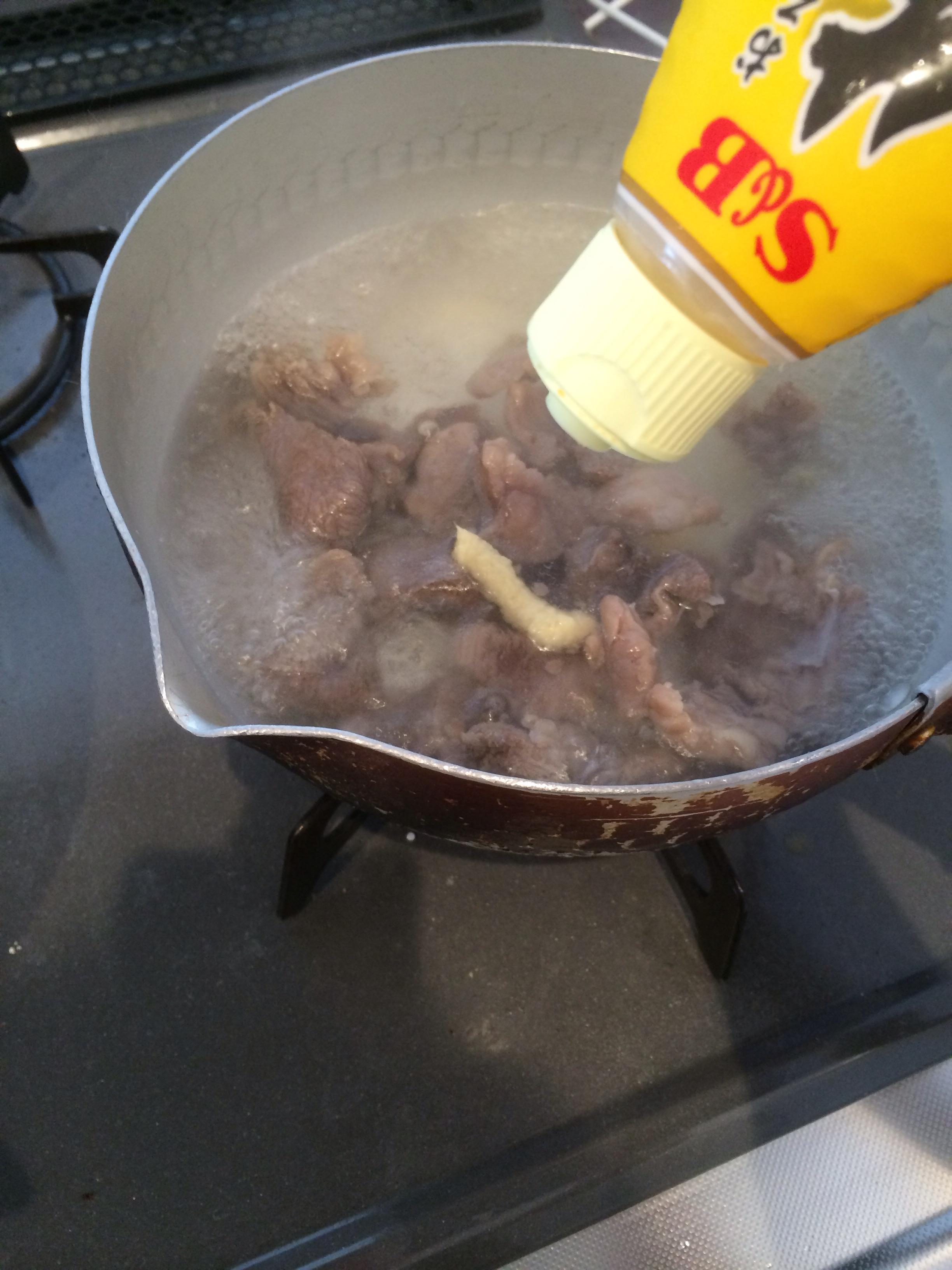 できたら今度は臭み消しに生姜と酒入れて茹でるよー