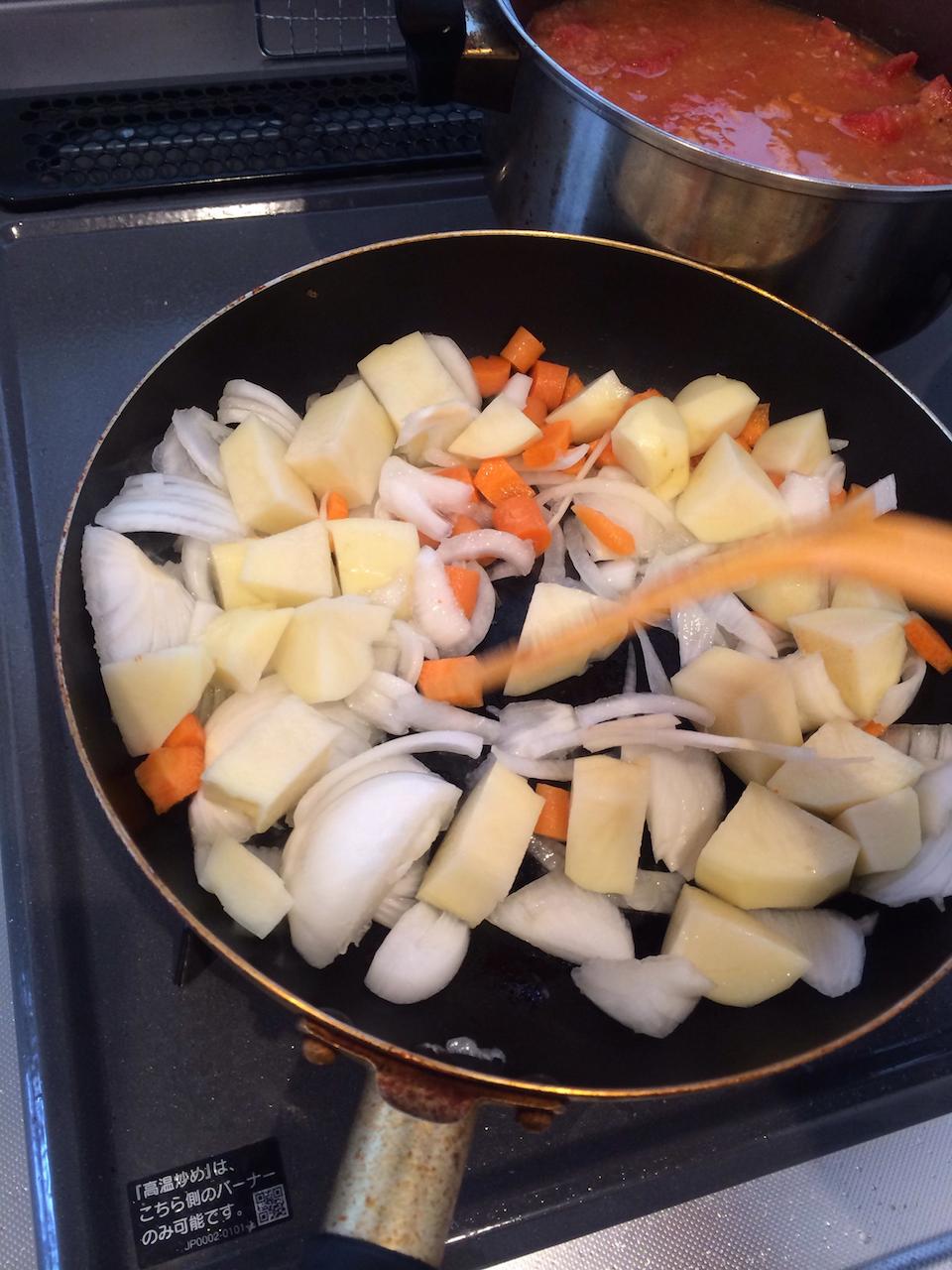 ほんとはめんどいからそのまま突っ込みたかったんだけど、炒めた方が油膜ができて旨味をとじこめるとかなんとかここで見たから炒めてみた*\(^o^)/*