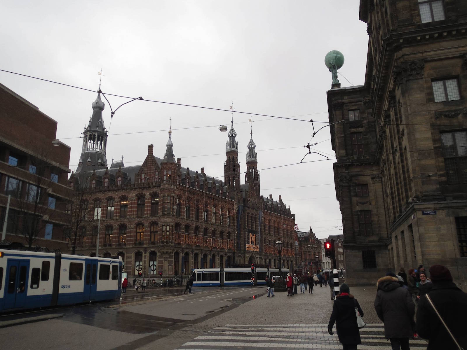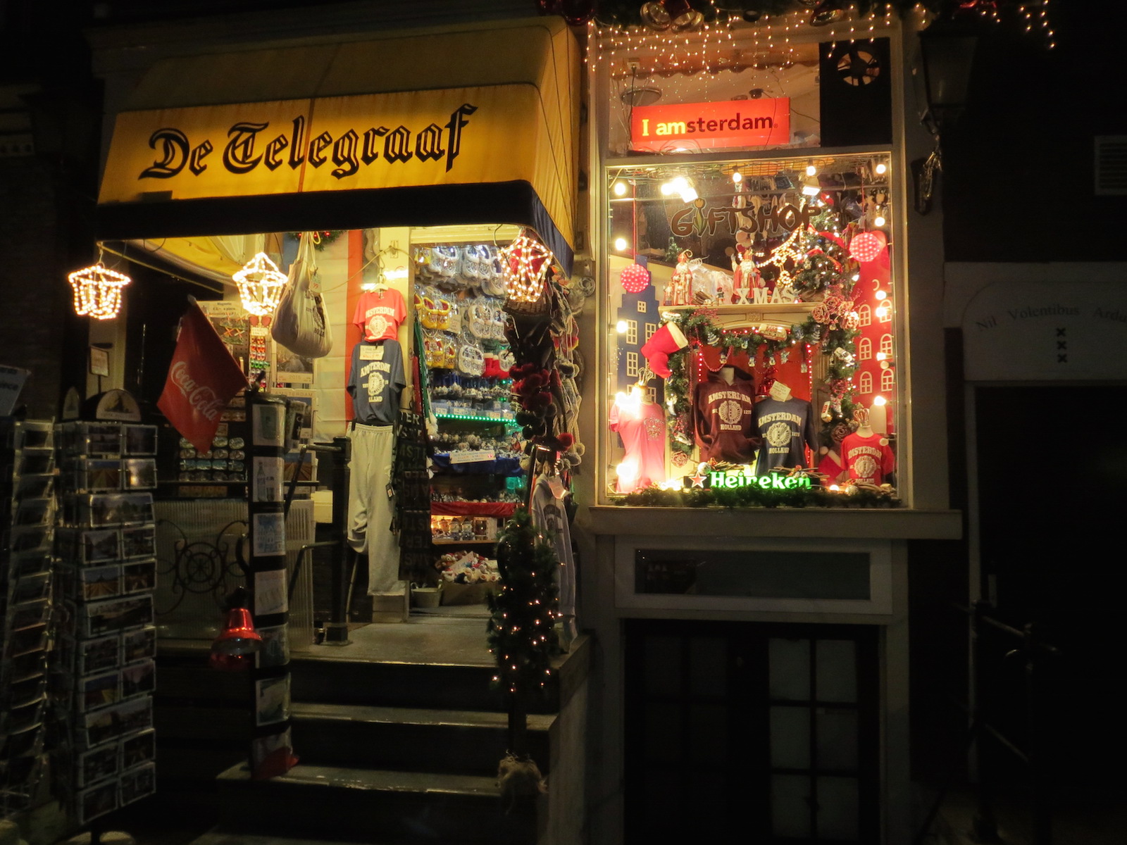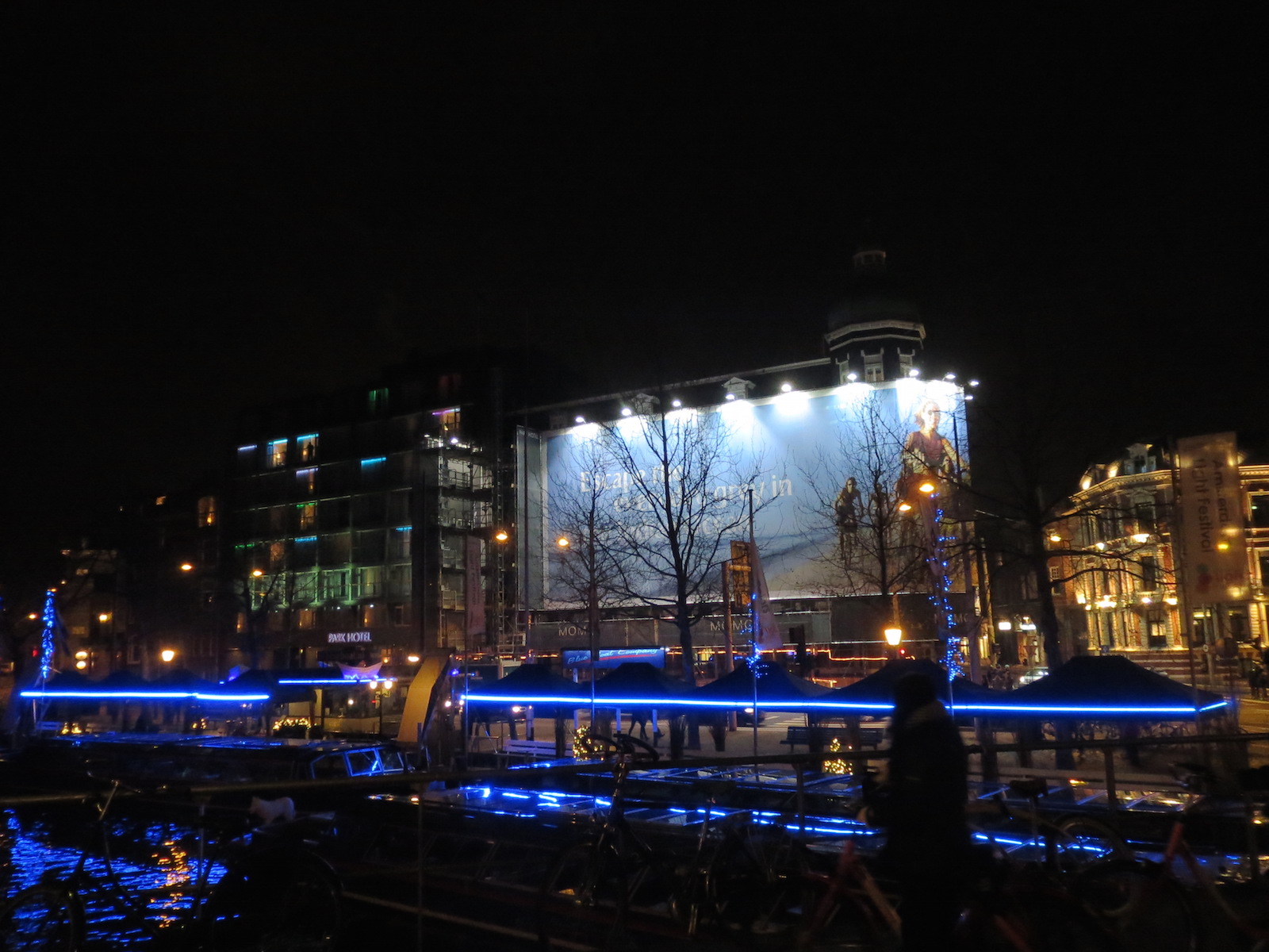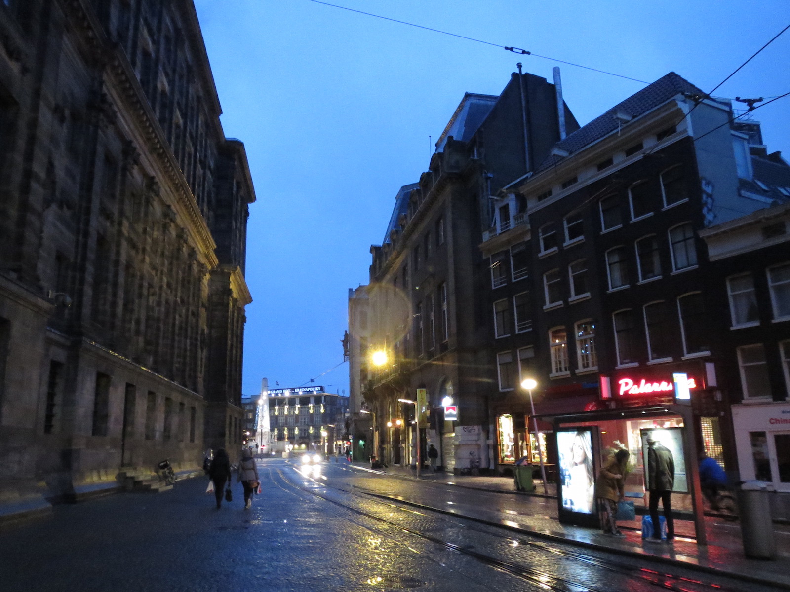 夜のダム広場。時期的にクリスマスなのでどこも綺麗な飾り付けが多い。