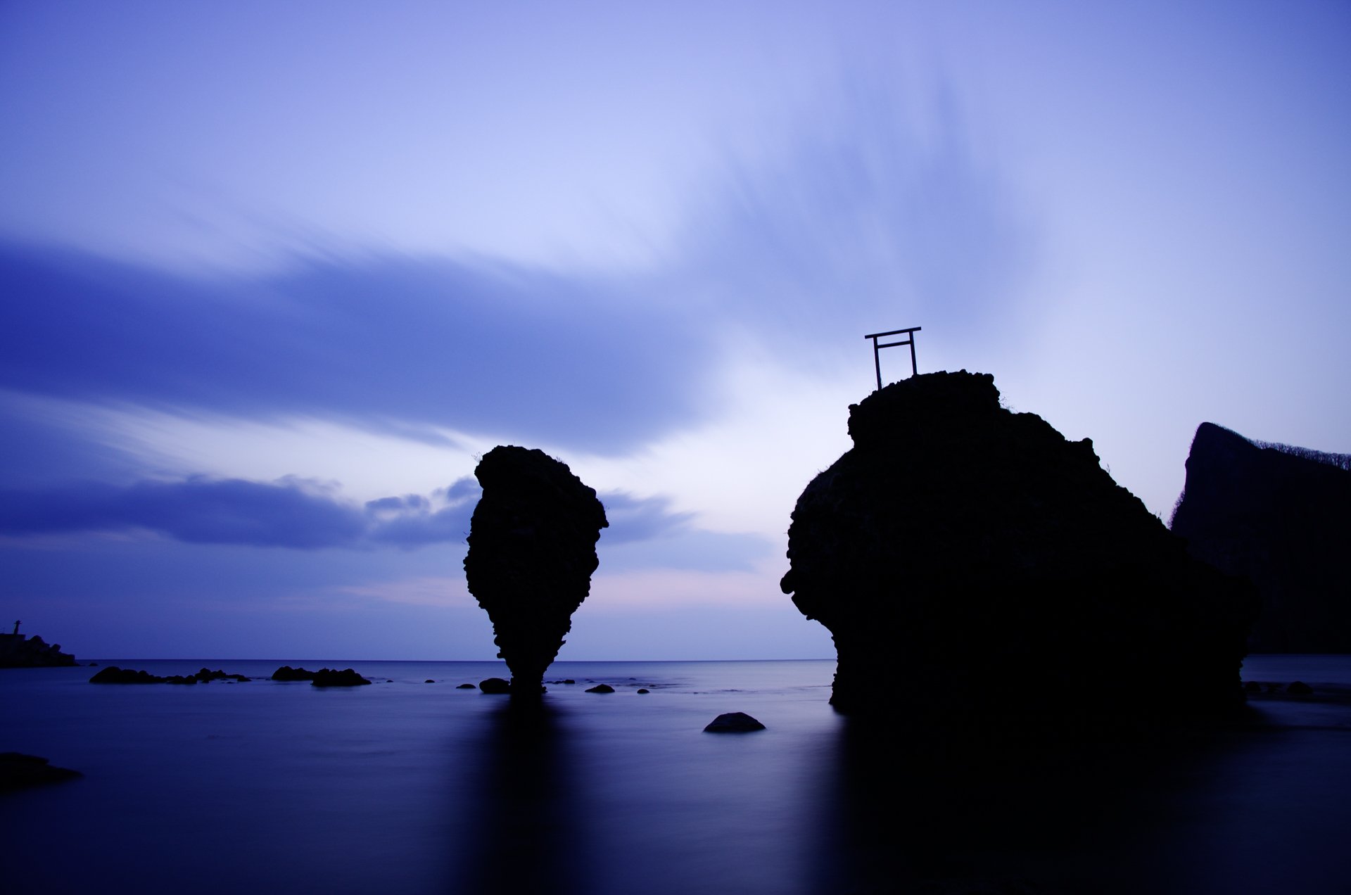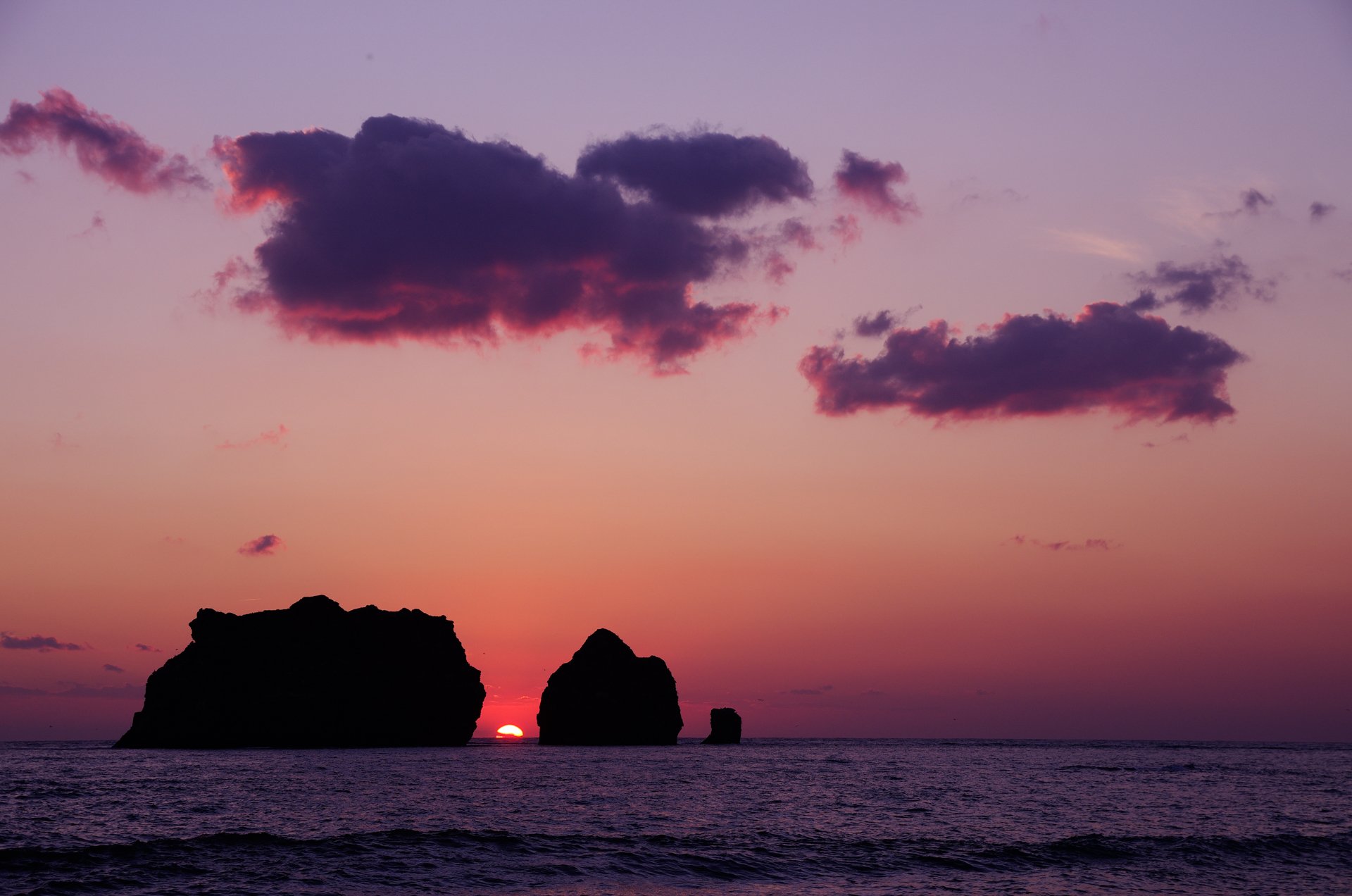 親子岩の間に夕陽を落とす