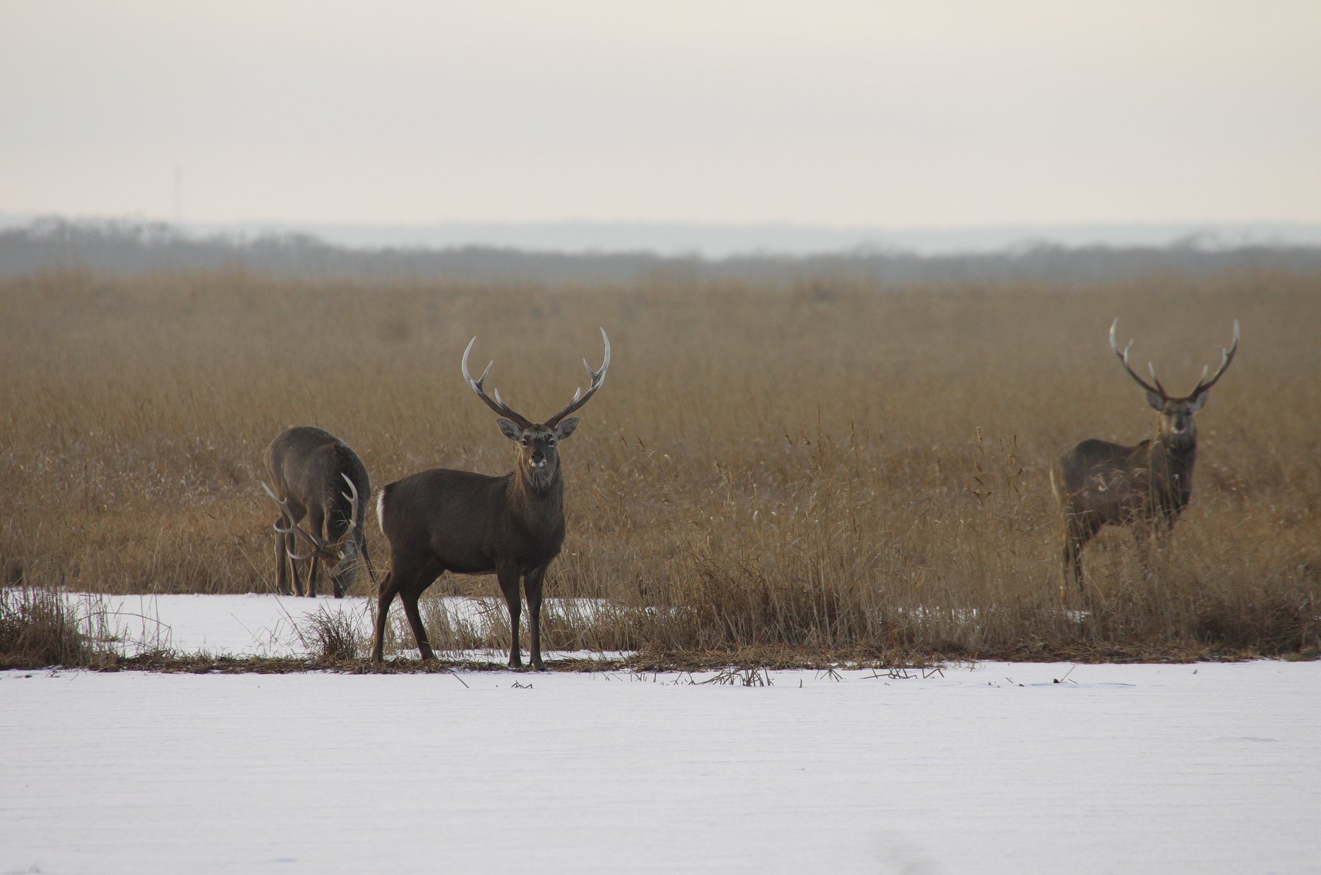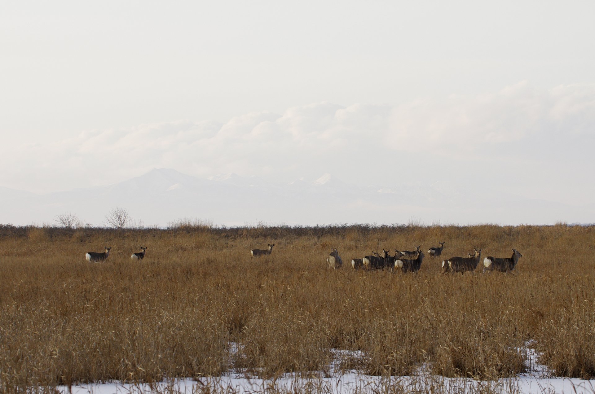 野付半島の奥のほうで鹿の群れ
