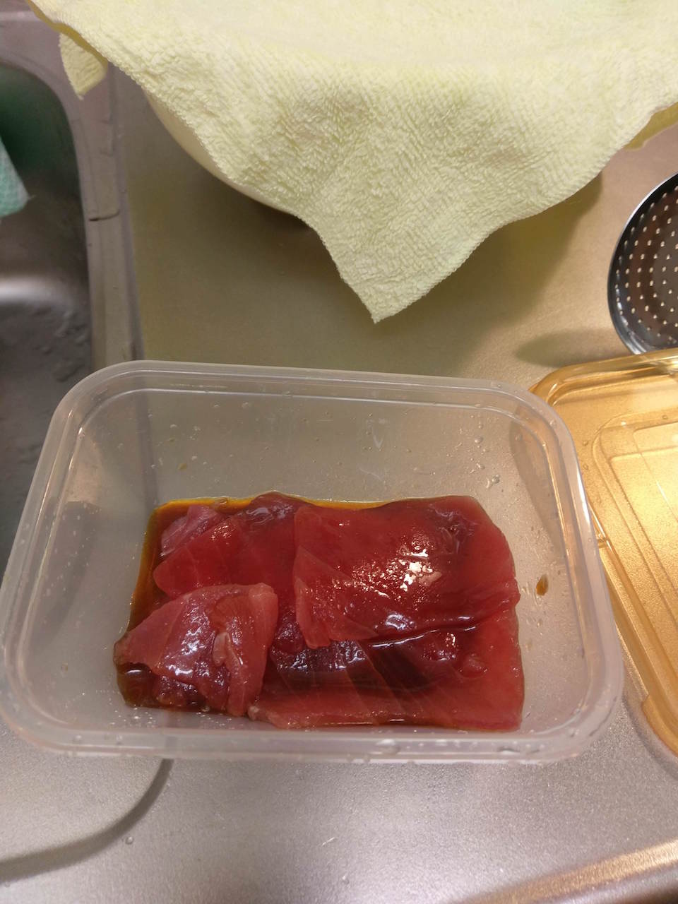 ことこと煮込む間に、マグロの切り落としも買ってきたんで漬けにしておきます