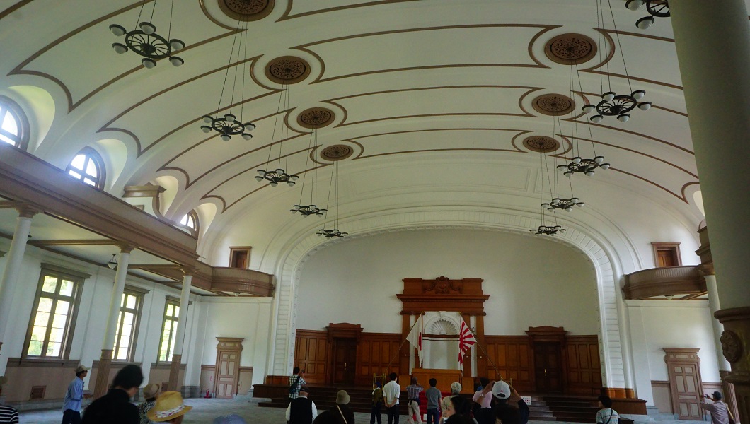 中は吹き抜けで2000名が収容できる。今も生徒の入学式、卒業式に