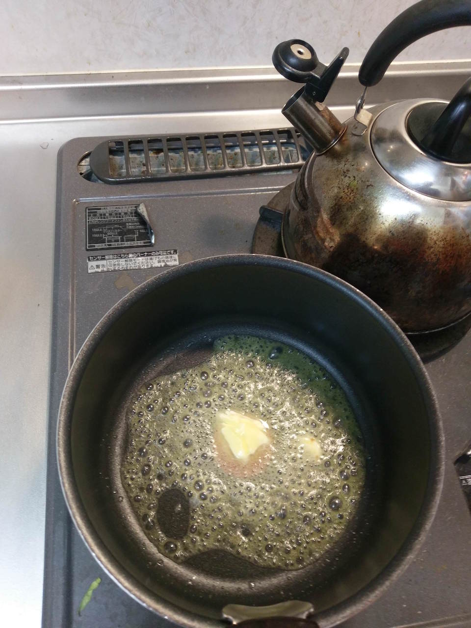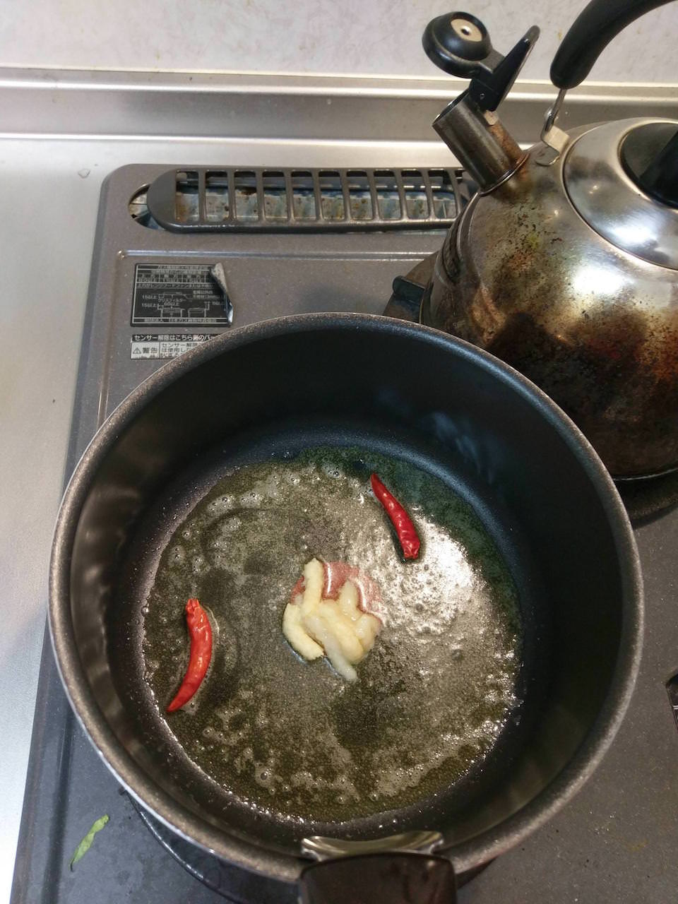 バターを溶かしきったら、そこにチューブのにんにくとしょうがと鷹の爪を入れて香りを出します