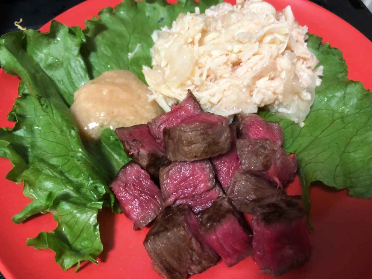 ステーキはスーパーで買った黒毛和牛モモを油なしで焼いた40g、