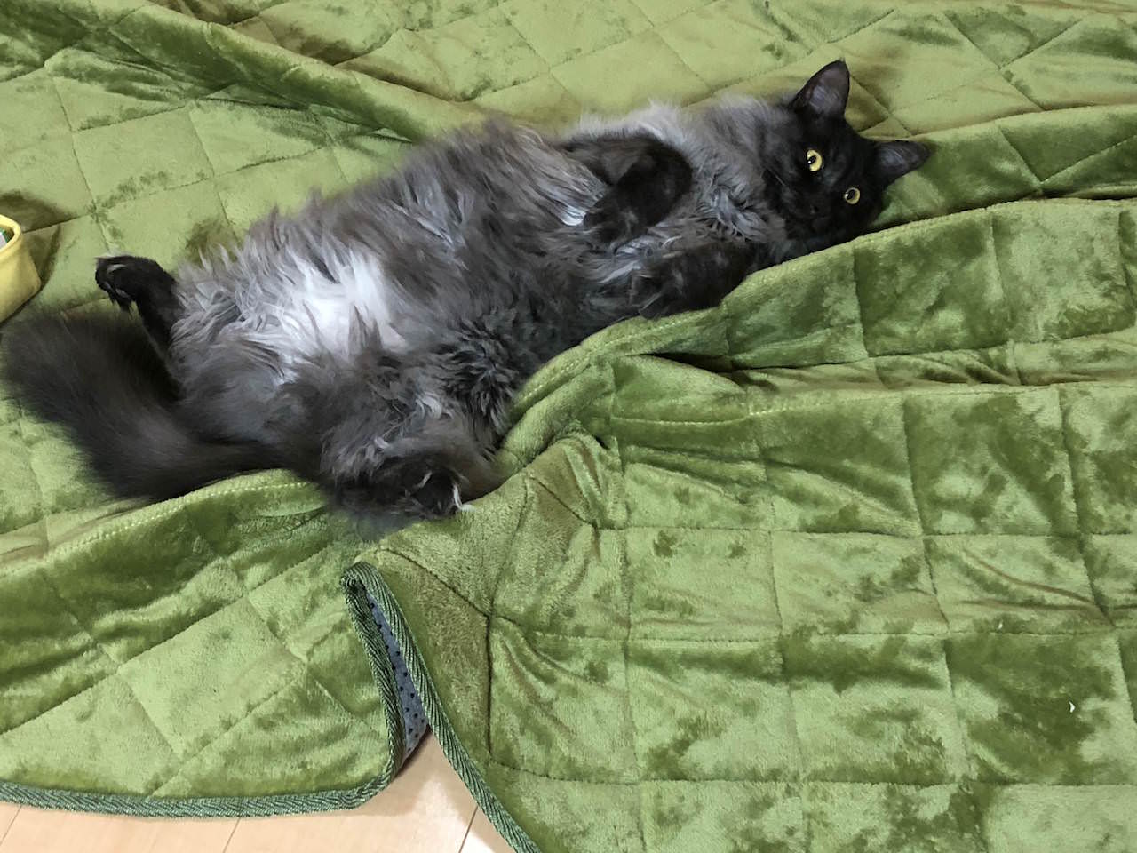 ベランダの前に古い敷きパッドを畳んでベット代わりに置いてからというもの毎日ここで過ごしてます。