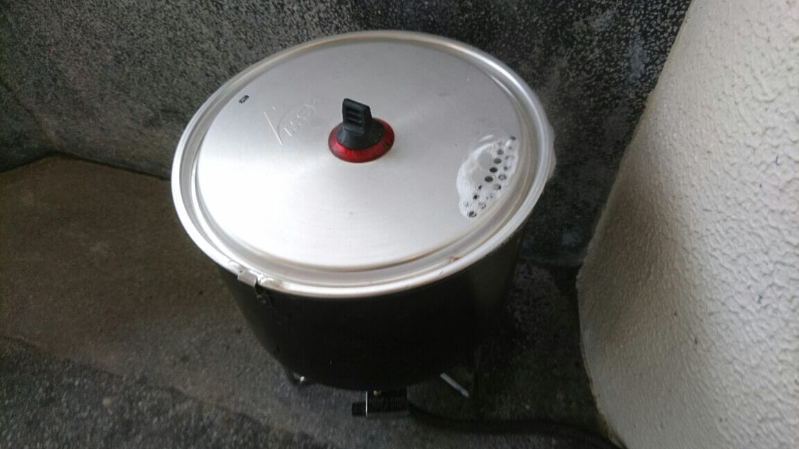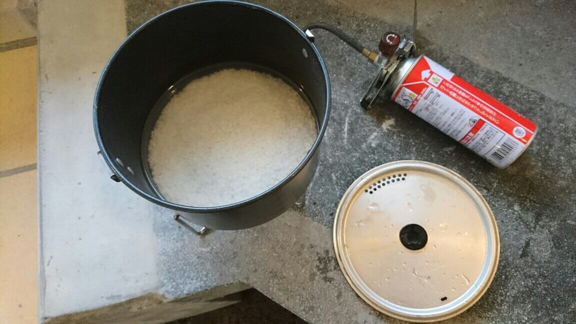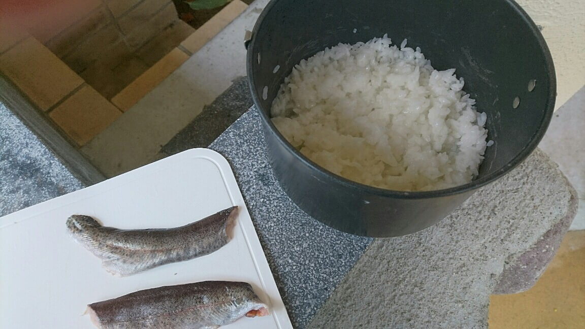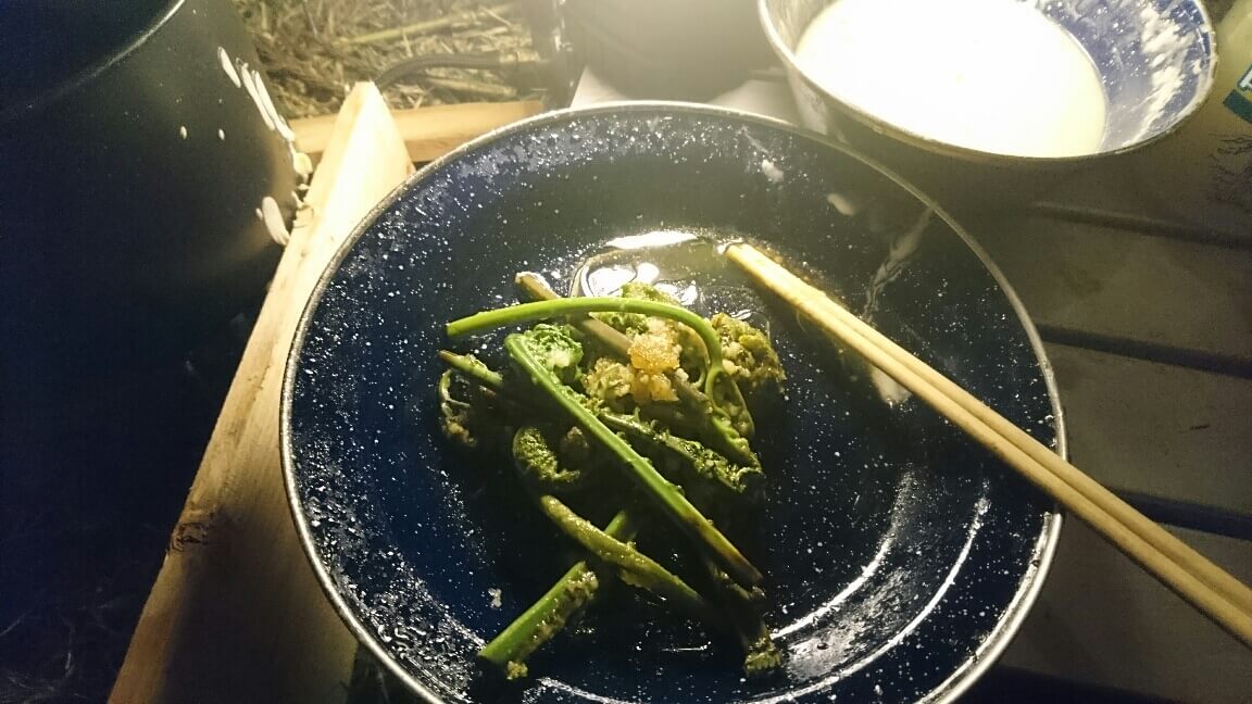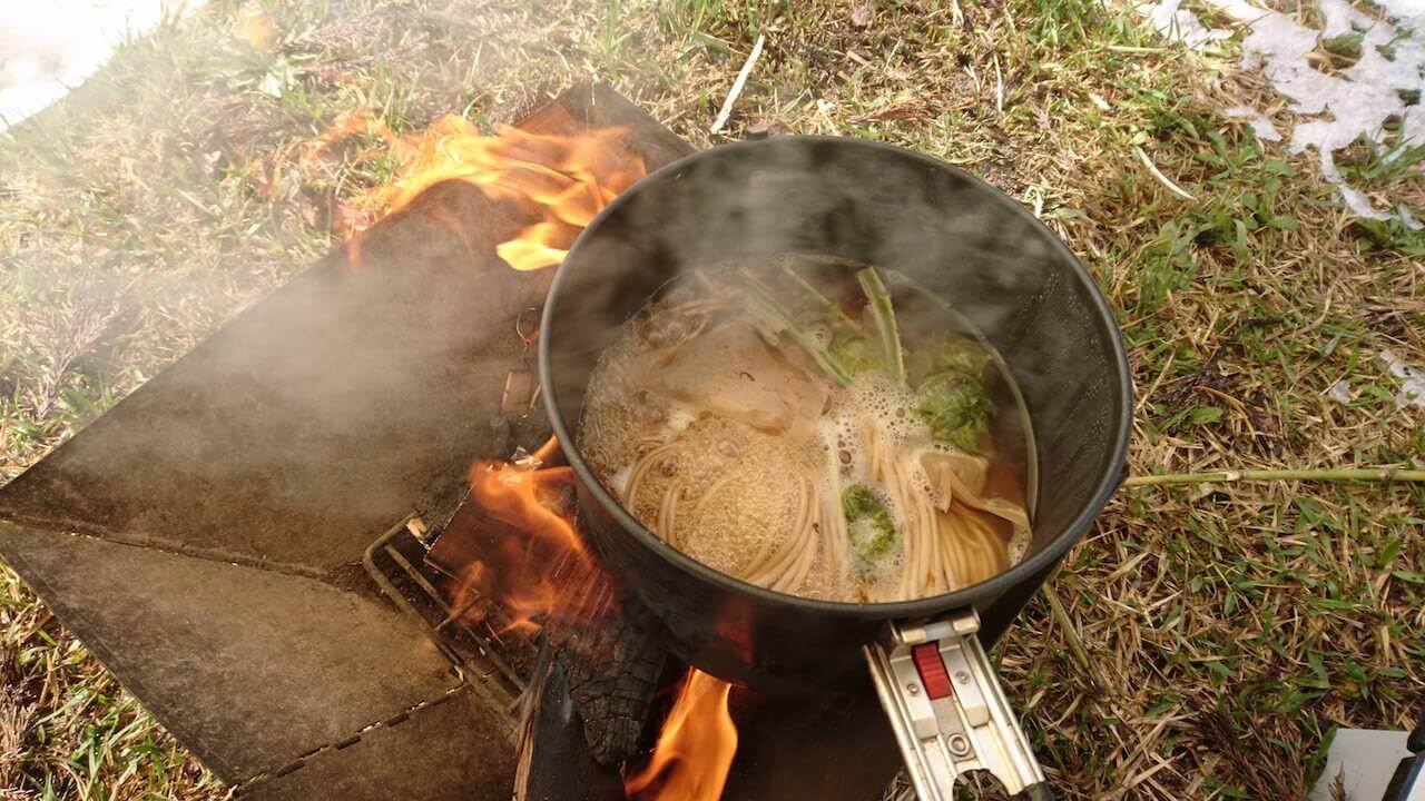 ガスボンベが空になり、焚き火で山菜と一緒に煮炊き。