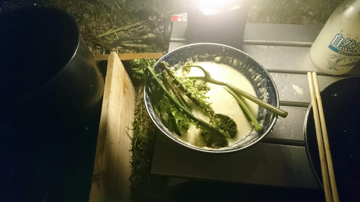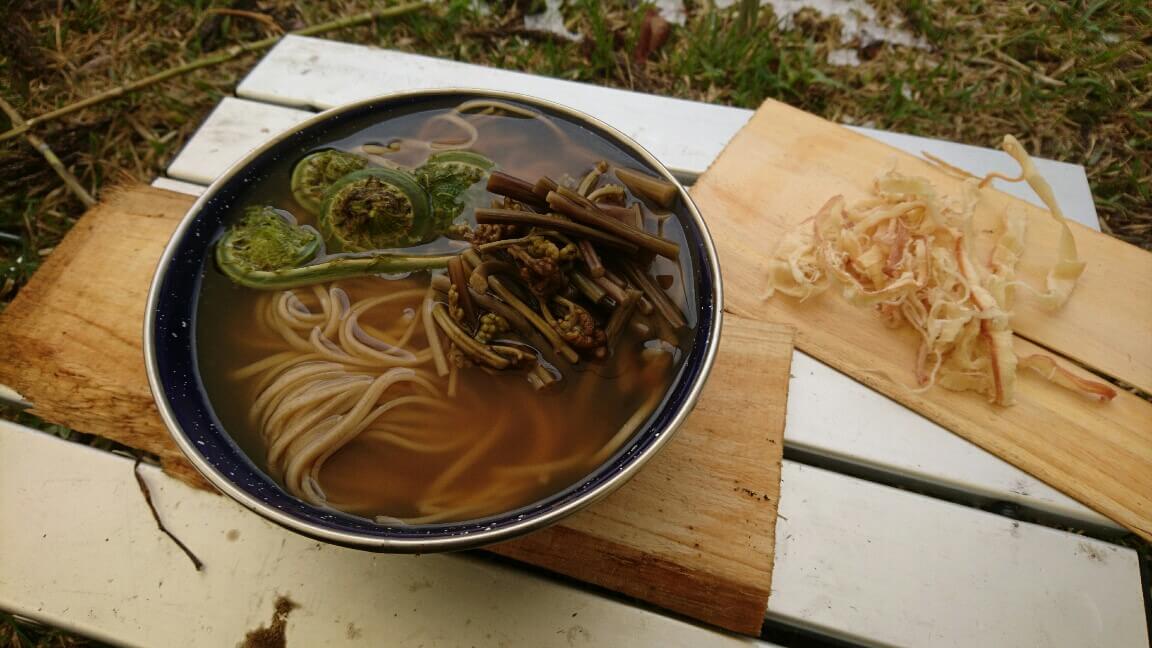 朝ごはんは、冷えてた体に染み渡る山菜そばをいただきました。