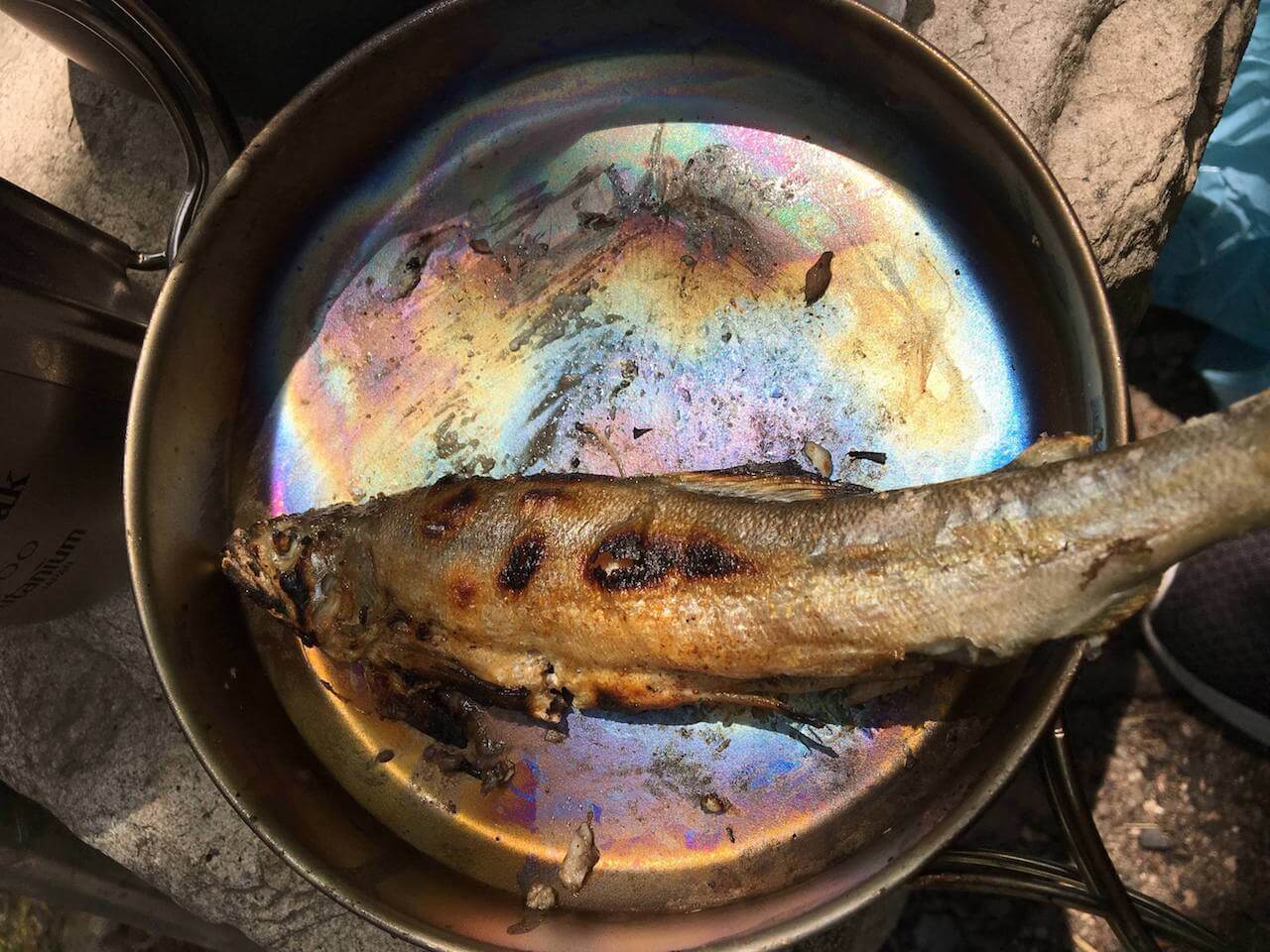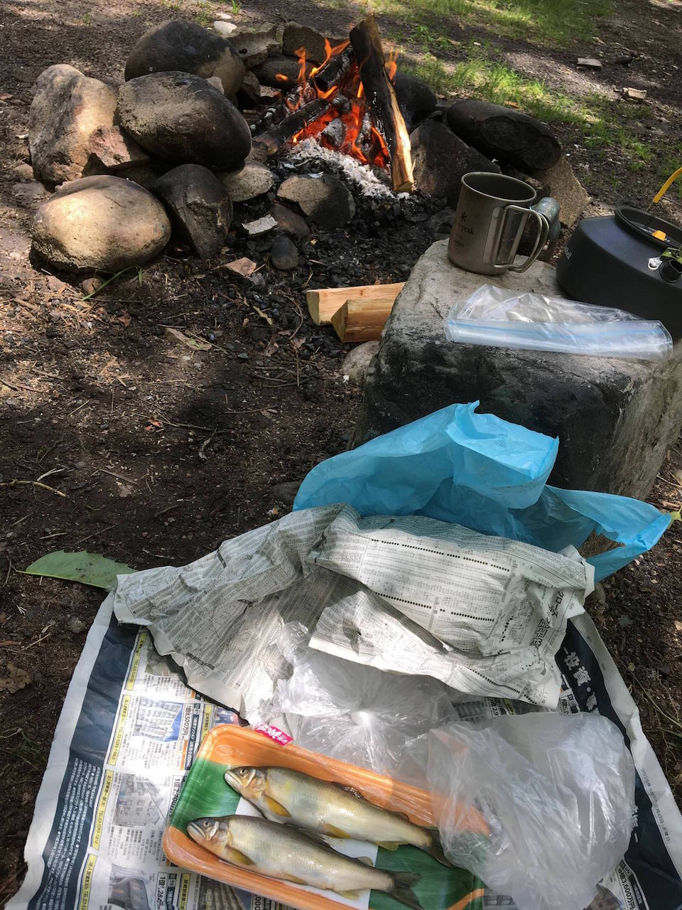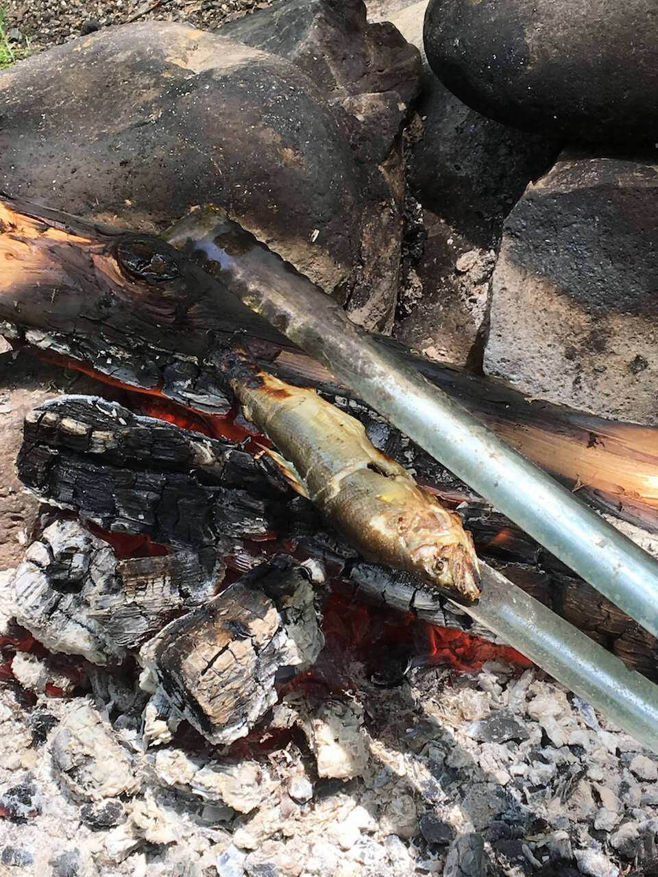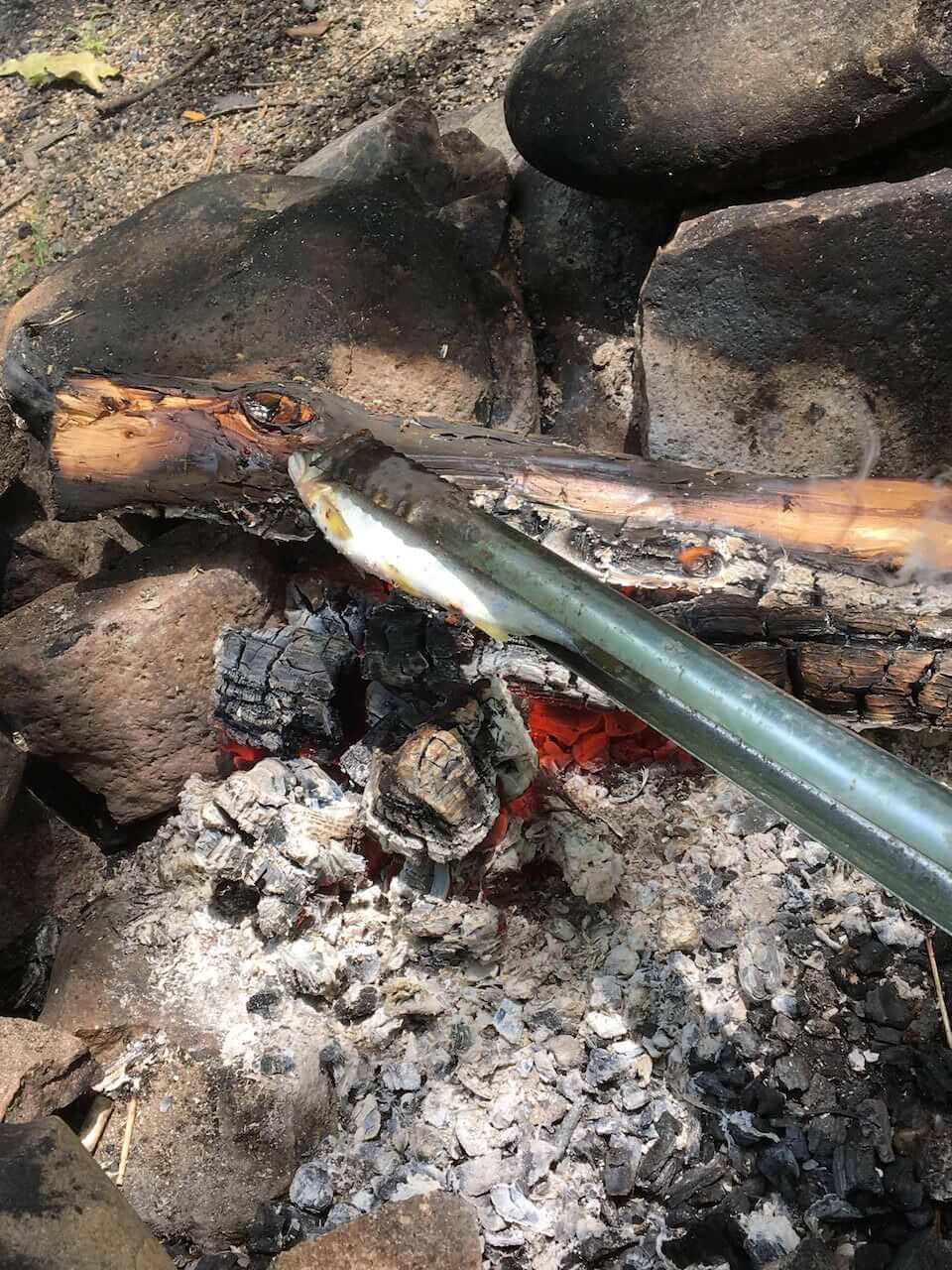 こういう火にすると、焚き火でも煤が出えへんから、魚が美味しく焼けるで