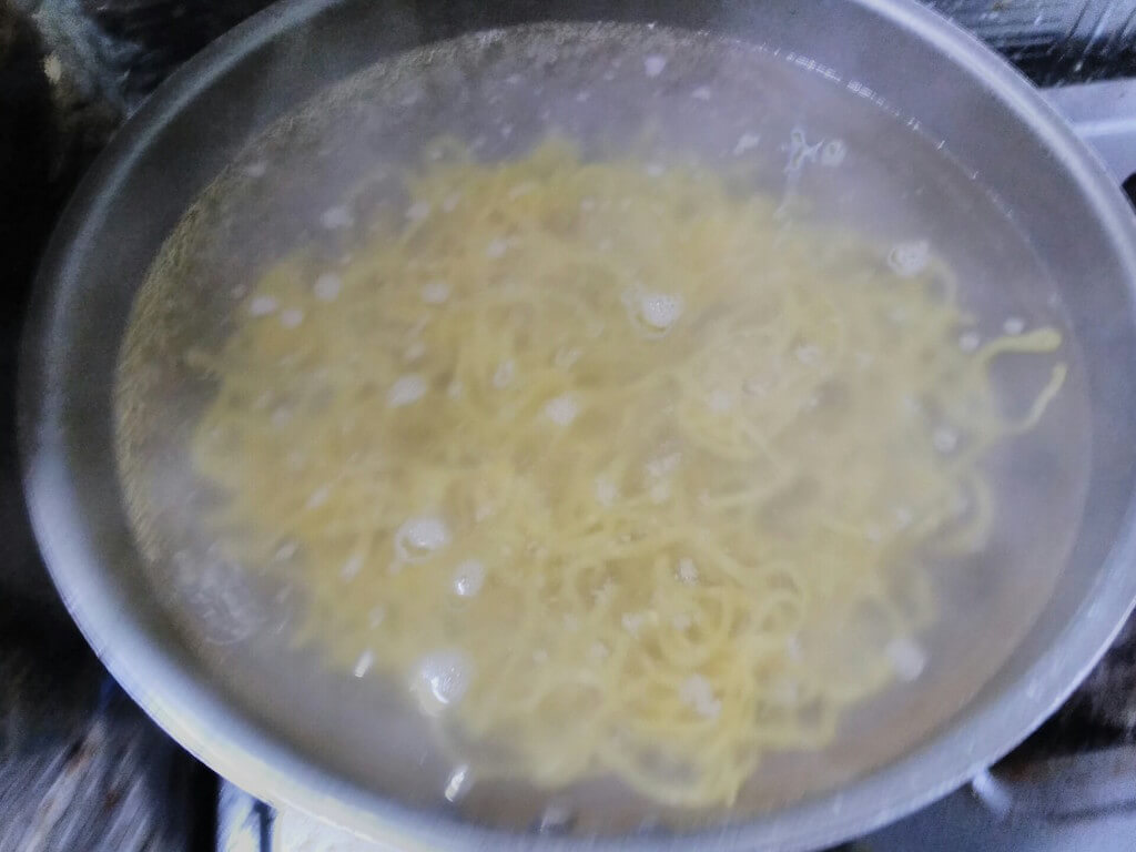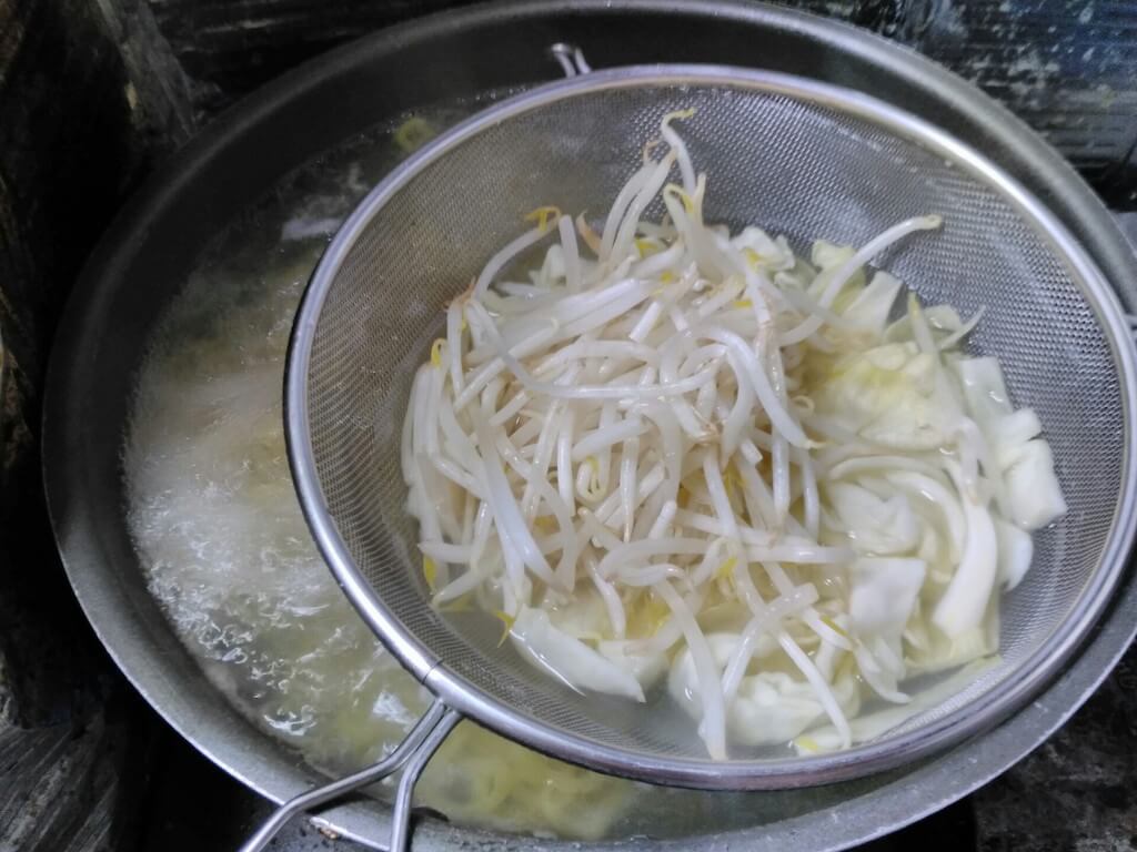 麺とヤサイ茹でるで、ヤサイはキャベツが茹で上がり一分前、モヤシは20秒前に茹で始めるで