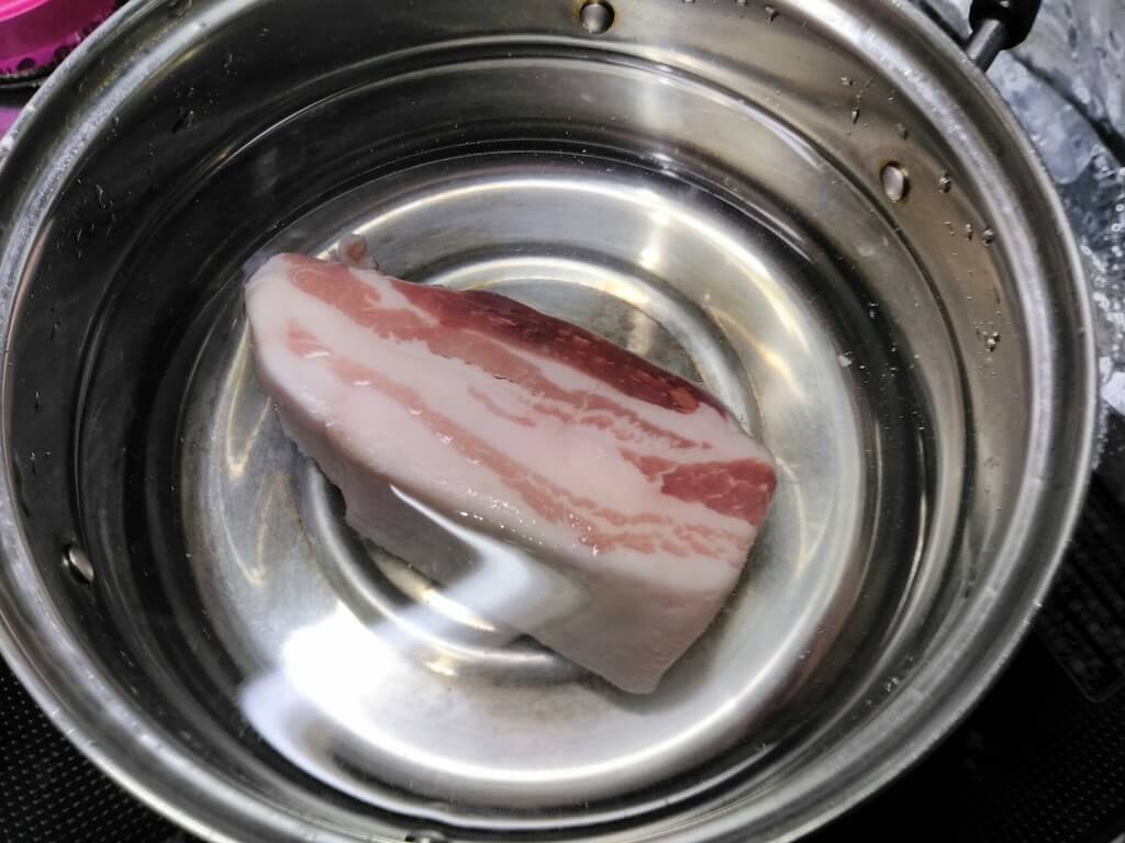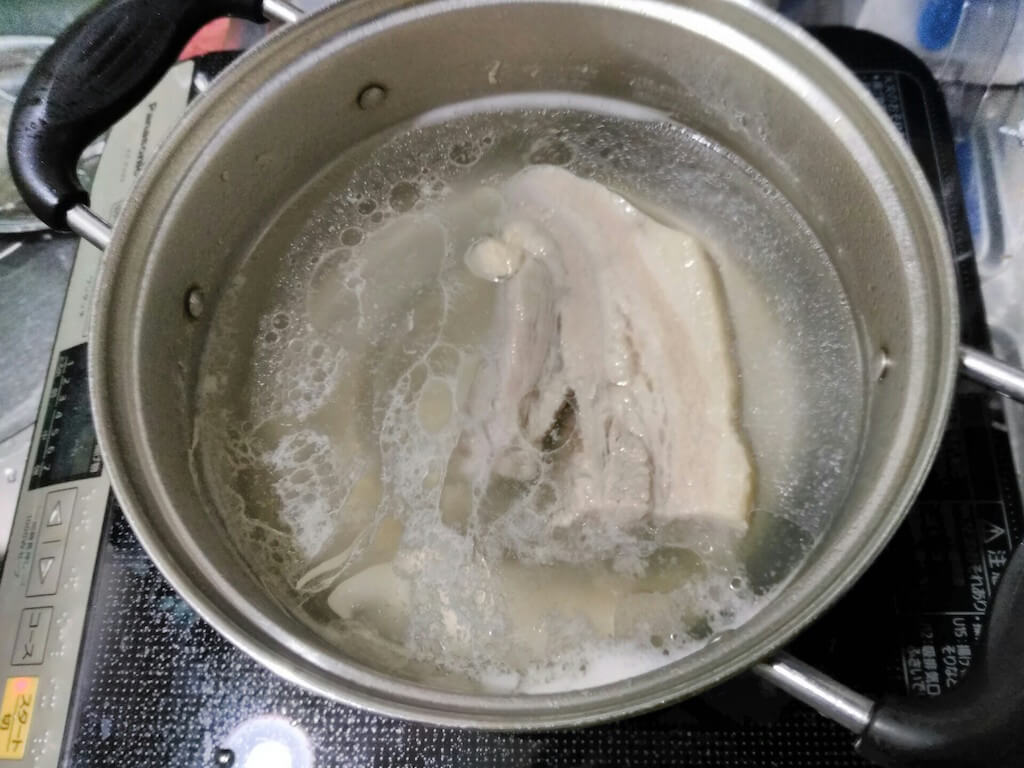 ほぼリアルタイムやから時間かかるで、まず豚バラかたまりを水から煮る