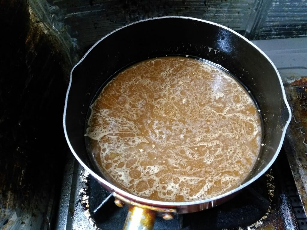 煮汁に先ほどの豚のタレやら市販の醤油豚骨スープ、ラード、グルタミン酸をこれでもかと入れてスープ完成や