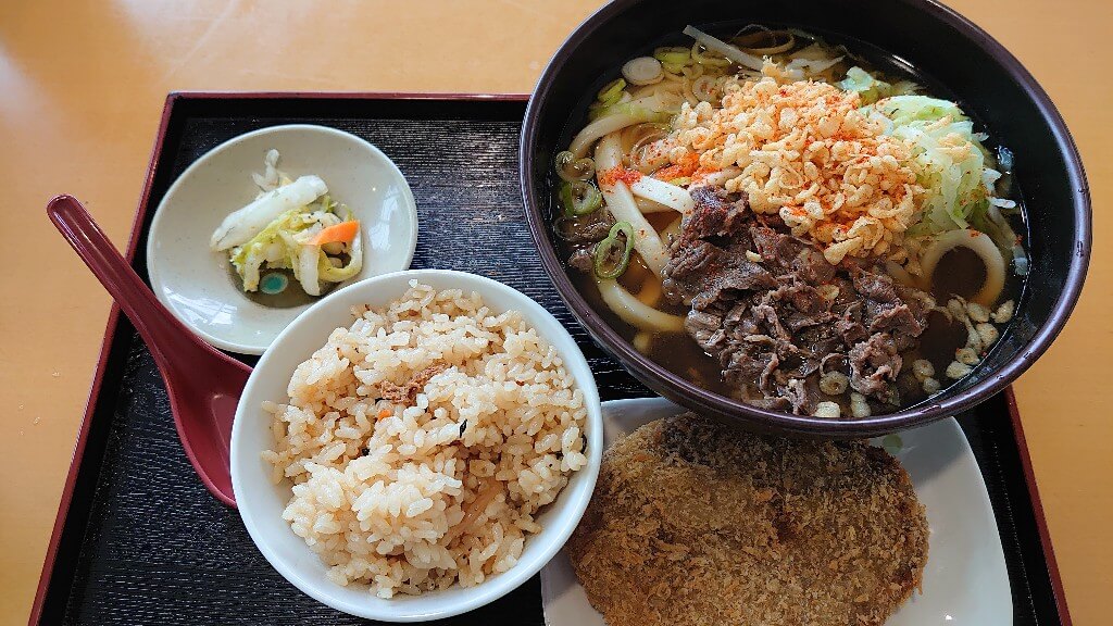 混ぜご飯セットの肉うどんと馬肉メンチ!!