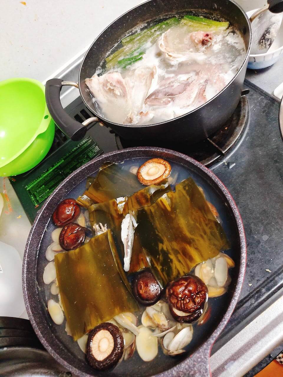 砂抜きが終わったらシジミとアサリ、そして戻した椎茸と昆布と煮干しを汁ごと投入!