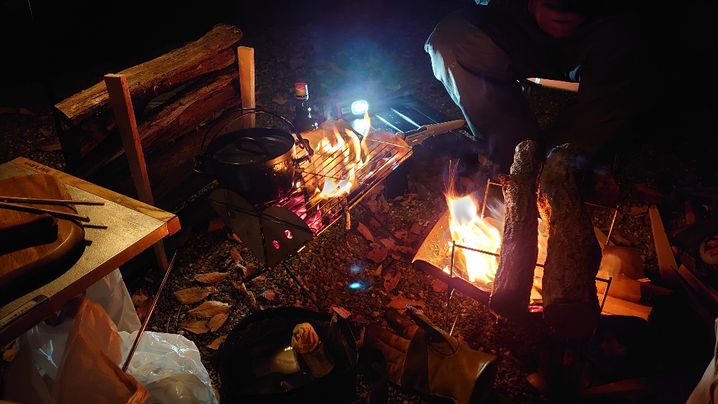 薪の量が多すぎたのとあまりにも寒すぎたので焚火台2台投入して暖をとりつつ調理開始!