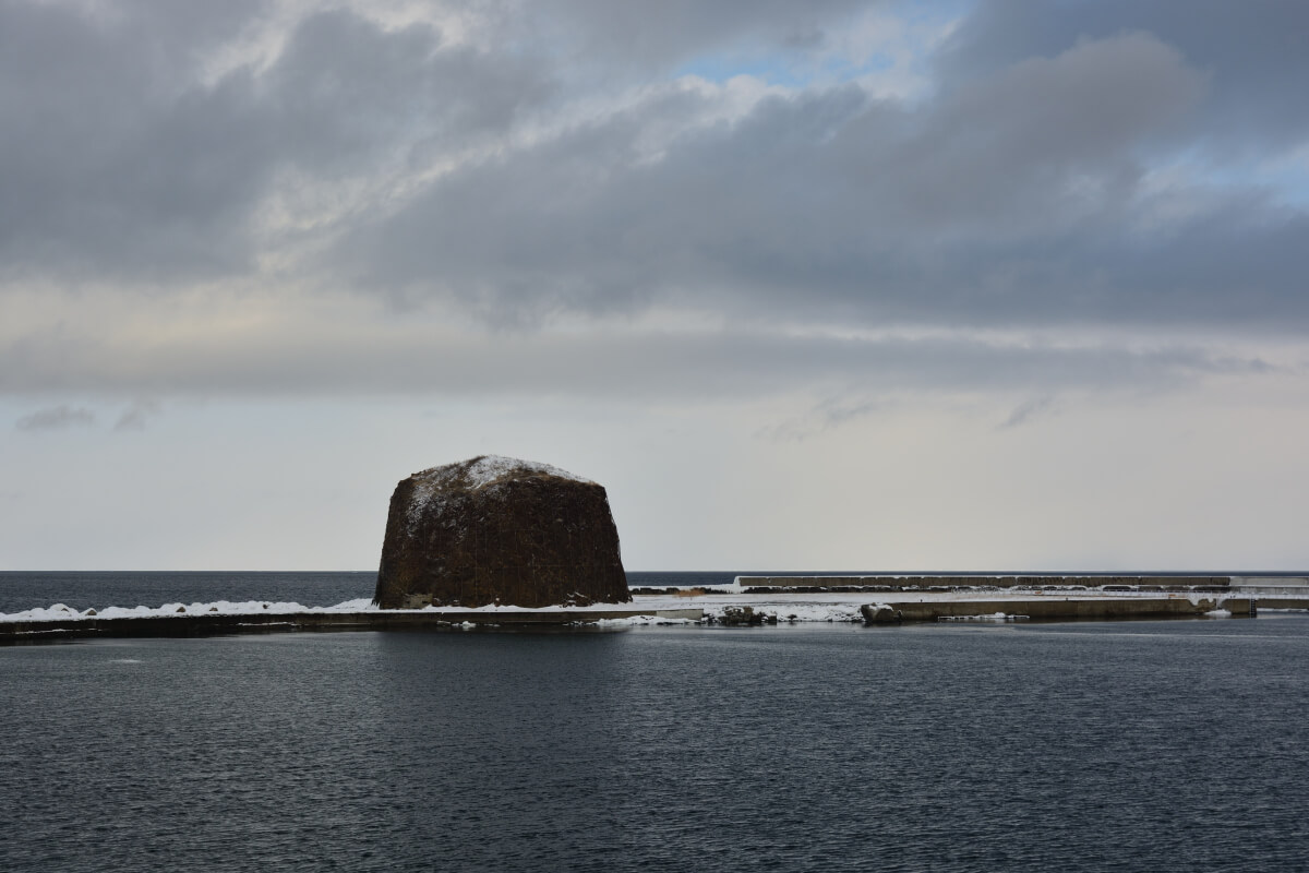 案内放送「進行方向左側に見えるのが、帽子岩です」