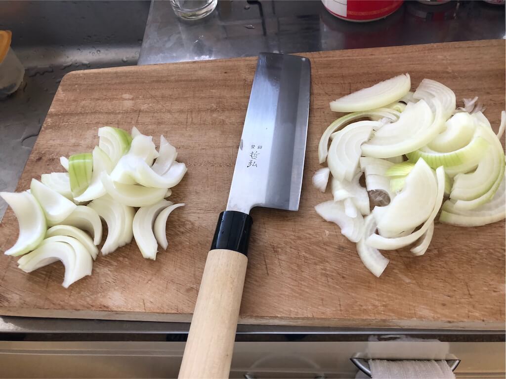 見て分かる通り、右側は短冊、左側は櫛形に切り分けてある。菜切り包丁を使うことで、目が痒くなることも避けられる。