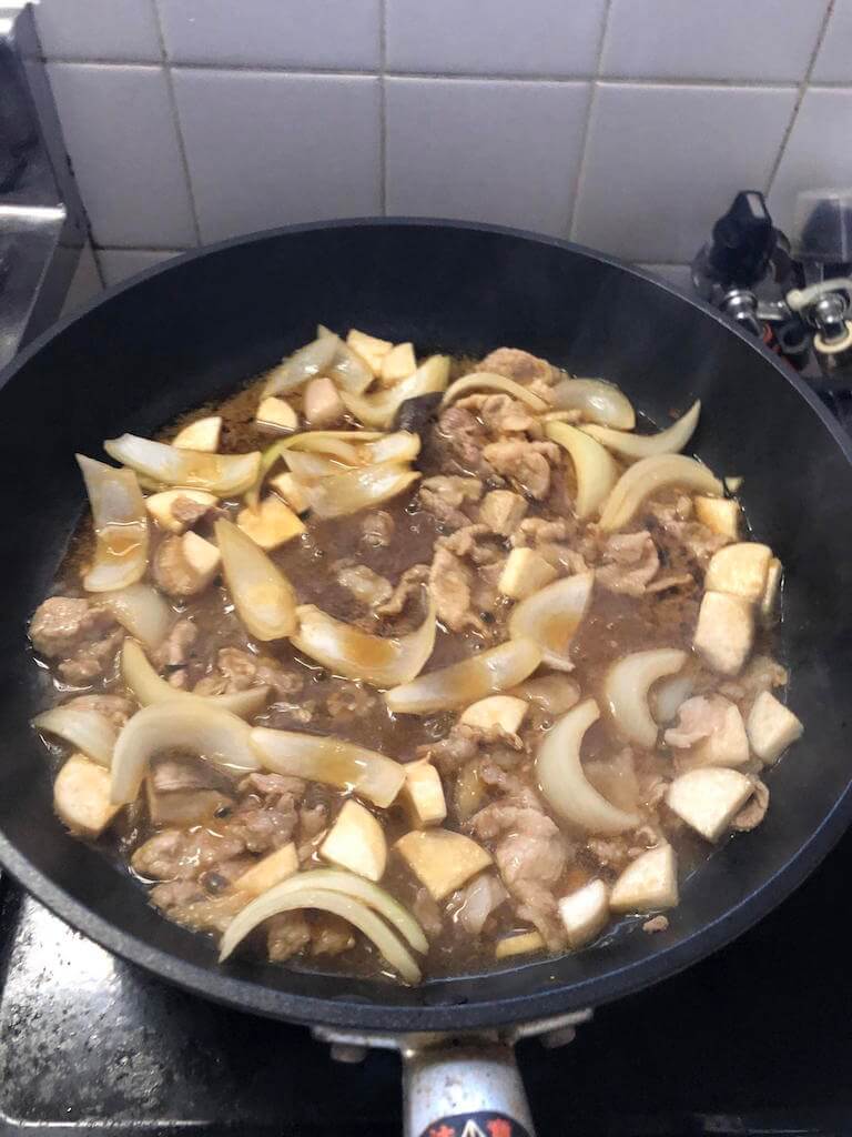 続いて、タレにつけておいた豚肉、たまねぎ、エリンギを投入する。