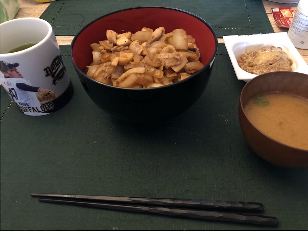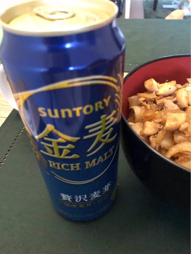 安いアルコールの隠せない風味が生姜丼の風味を誘う。玉ねぎの二重の歯応え、硬めのご飯、全てベストバウトだ。箸休め的に食べる納豆と味噌汁の旨味も相まって、また金麦に誘われていく…