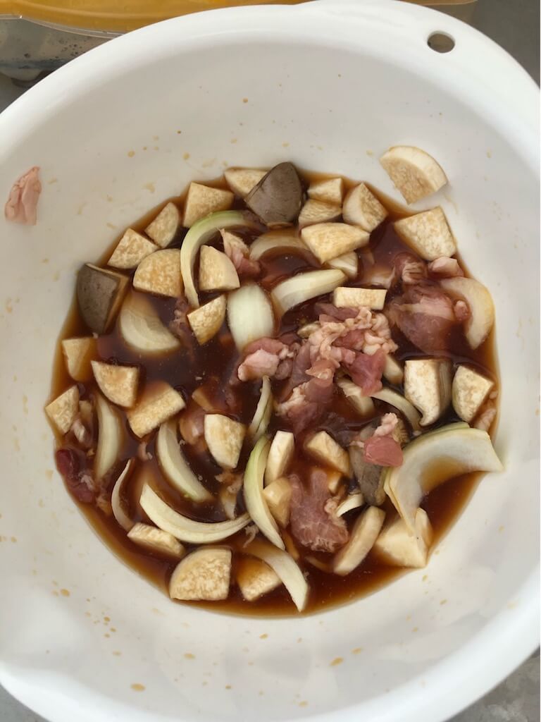 醤油、出汁、酒、水、生姜で合わせたタレに豚肉を入れよう。櫛切りにしたたまねぎとエリンギも一緒に入れてしまおう。そしていざ、炊飯器のボタンを押そう。早炊きのほうがふっくらしてうまいご飯が作れるぞ