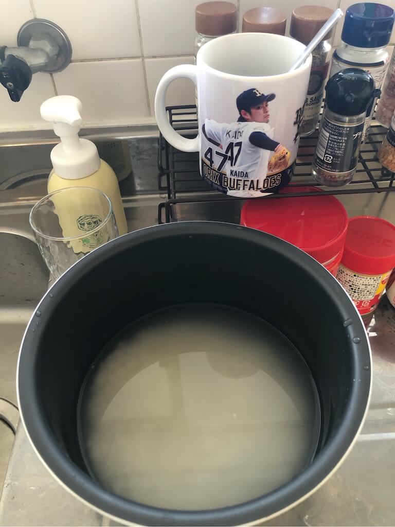 研ぎ水は真水、給水はぬるま湯で行う。およそ10分が目安だ。研ぎ具合は少しぬかが残る感じがいいだろう。銀シャリを作る場合は真昆布などを入れるが今回は用途が違う。米の風味を生かした形に仕上げるのがプロってもんだ。