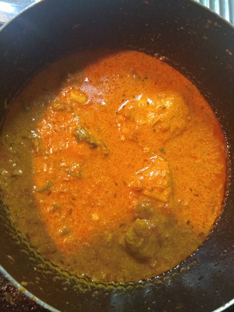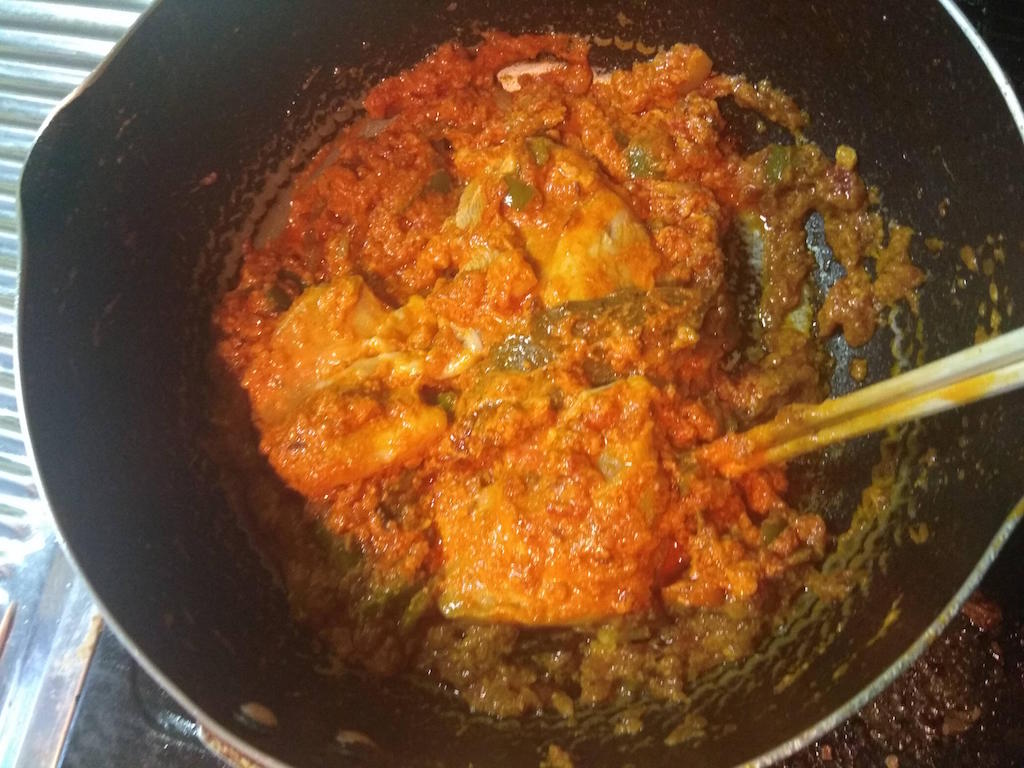 パウダースパイスと馴染んだら鶏肉投入!今回はタンドリーチキンに漬け込んだ肉だけど普通の肉たけでもヨーグルトとかココナッツミルクいれてもいいよ