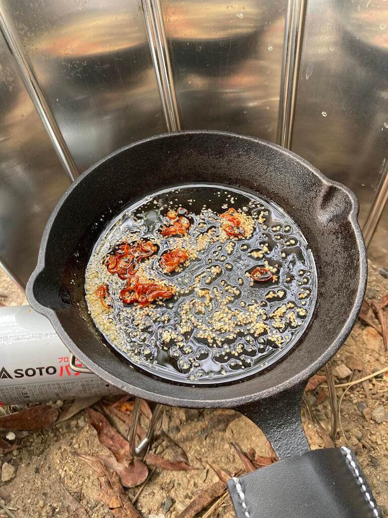 オリーブオイルをゆるりと熱してニンニクと鷹の爪の風味を移します