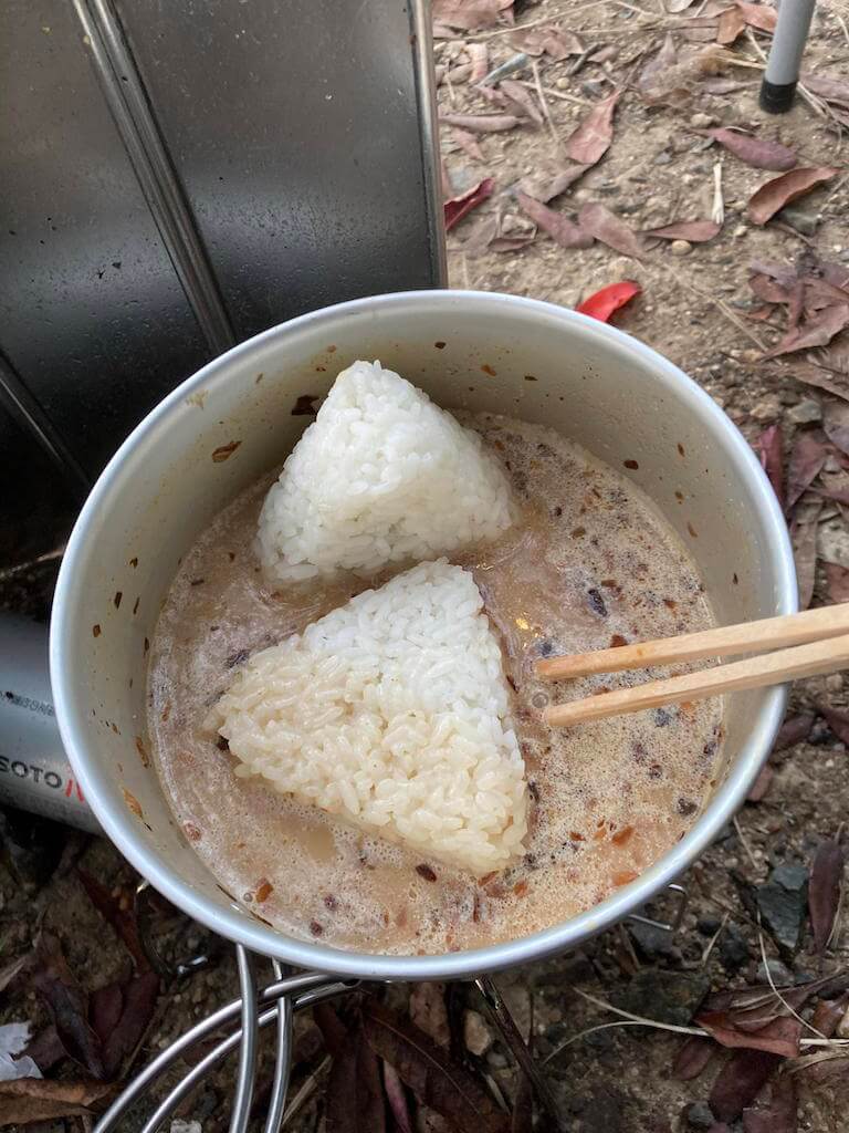 スープを残しつつラーメンを食べたら高菜おにぎりの海苔を外して投入!