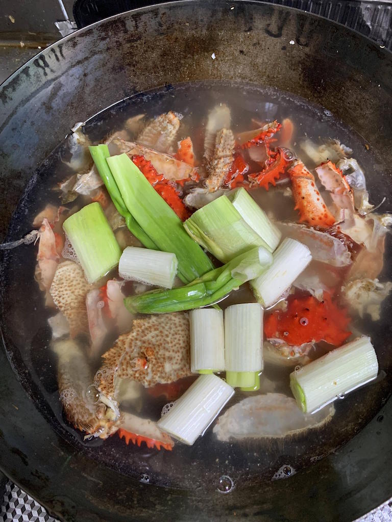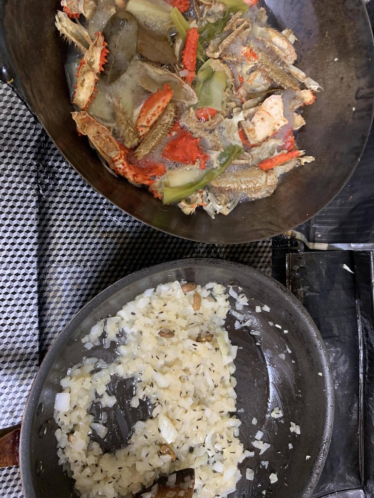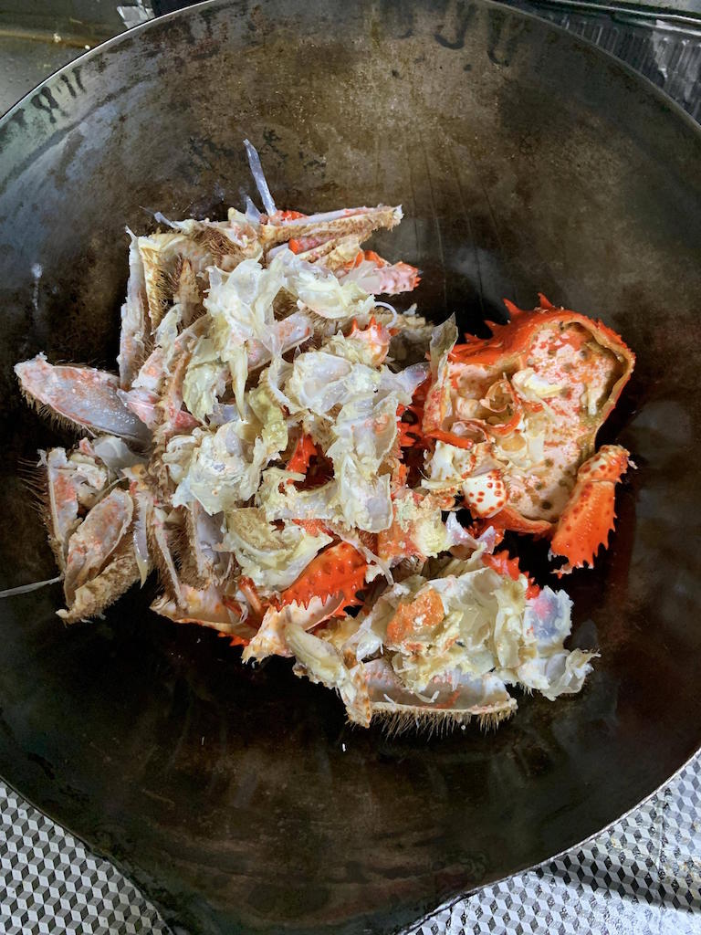 あと蟹味噌を擦ったニンニクで炒めてカニ身をいれるんやった