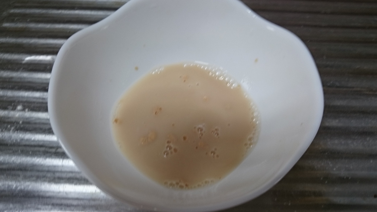 まずは恒例ドライイースト4gほどを砂糖少々で予備発酵させておきます