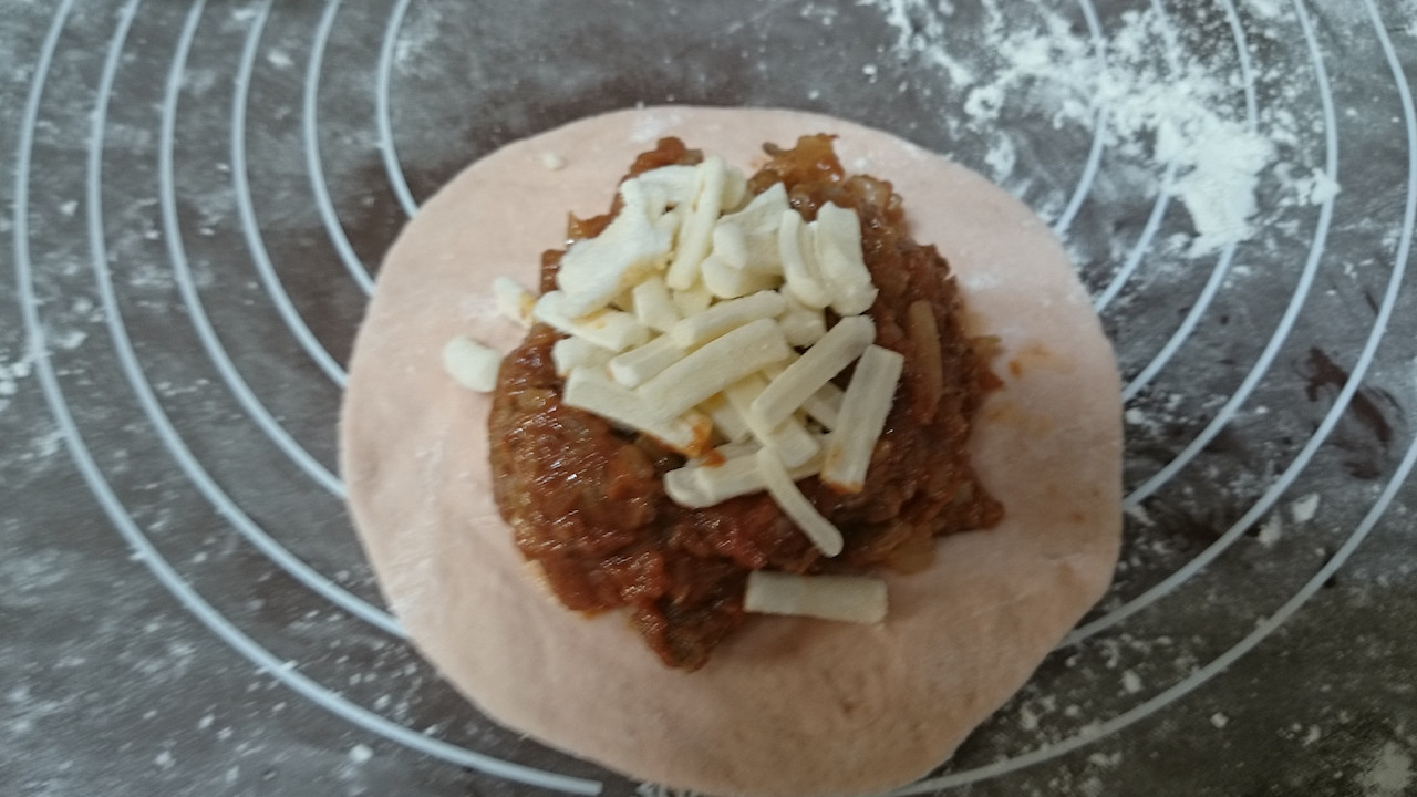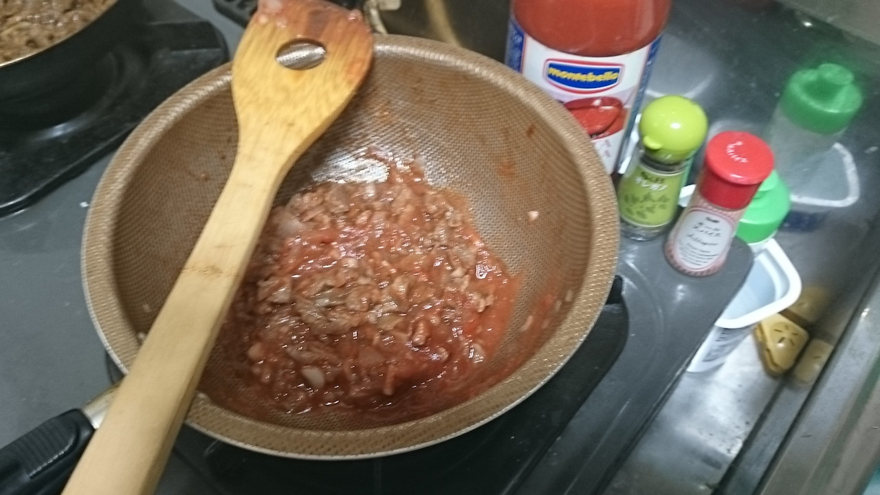 半分に分けた基本餡材料にはトマトペースト・オレガノ・オールスパイスで味付け