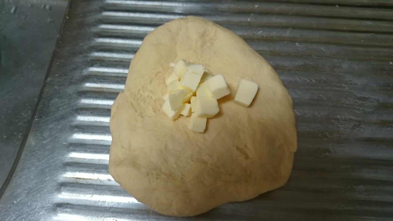 ある程度捏ねた生地にバターを混ぜ込んでいくよ!