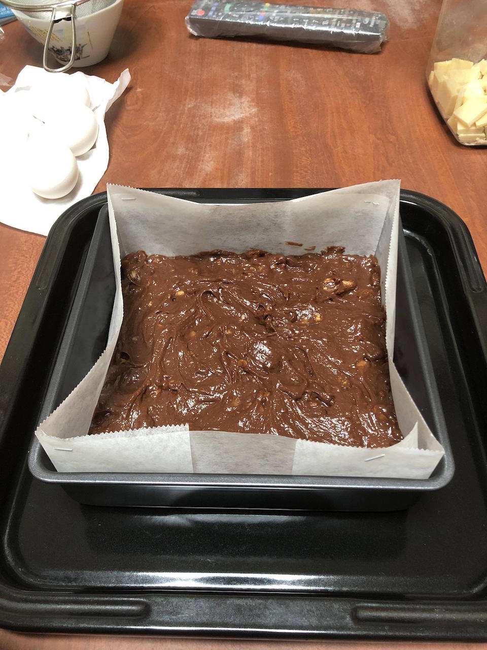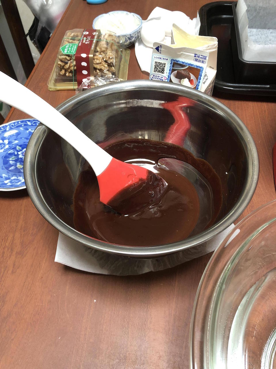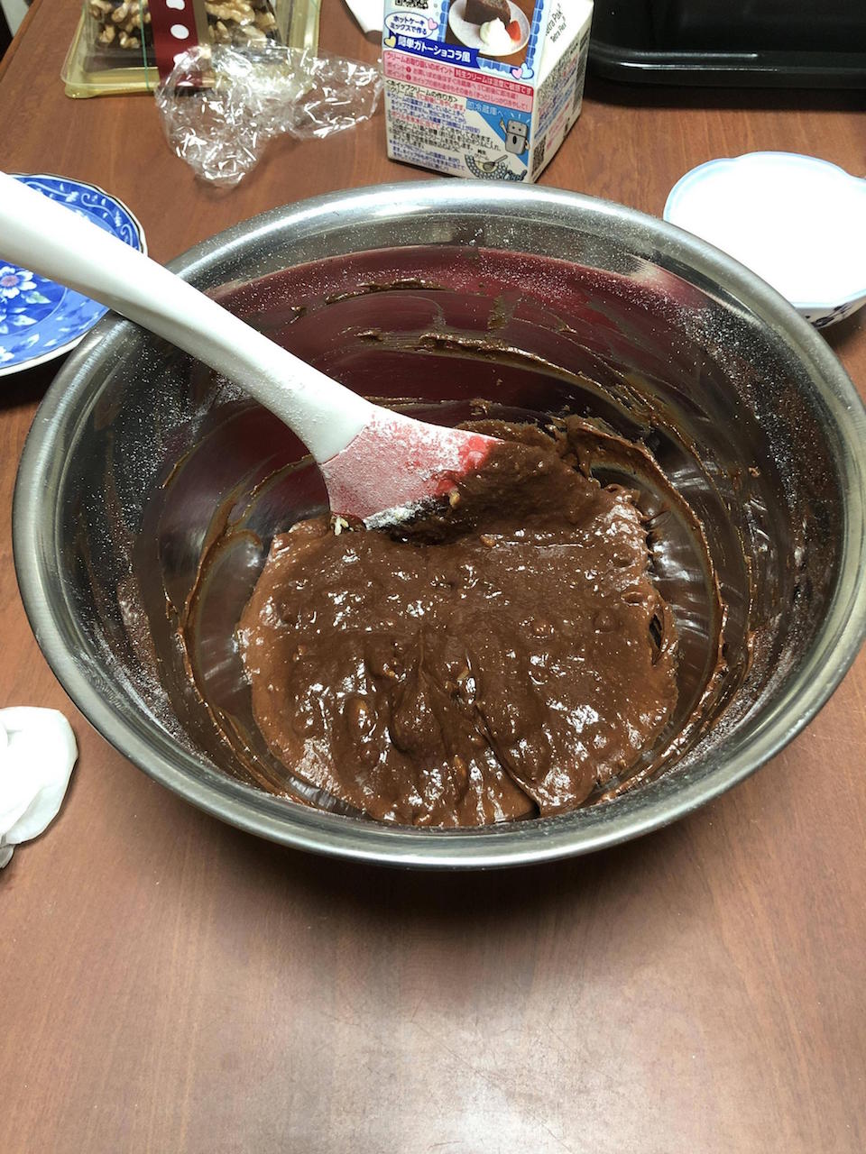卵混ぜて小麦粉とアーモンドパウダー振るって混ぜてくるみを刻んで混ぜた