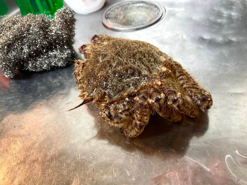たわしでゴシゴシして汚れを取るんやが、生きているとやりづらいので、