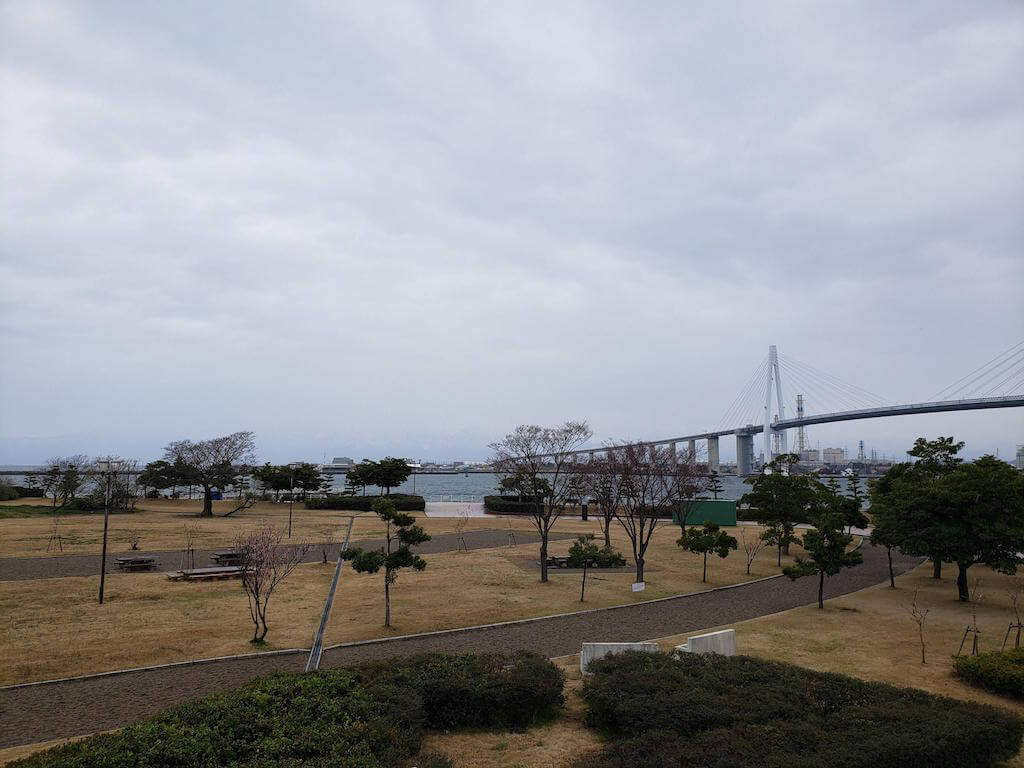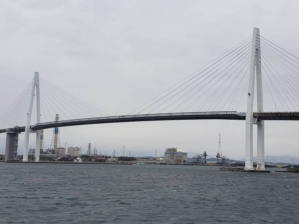 仕方ないので入場規制されてないエリアから新湊大橋を眺める