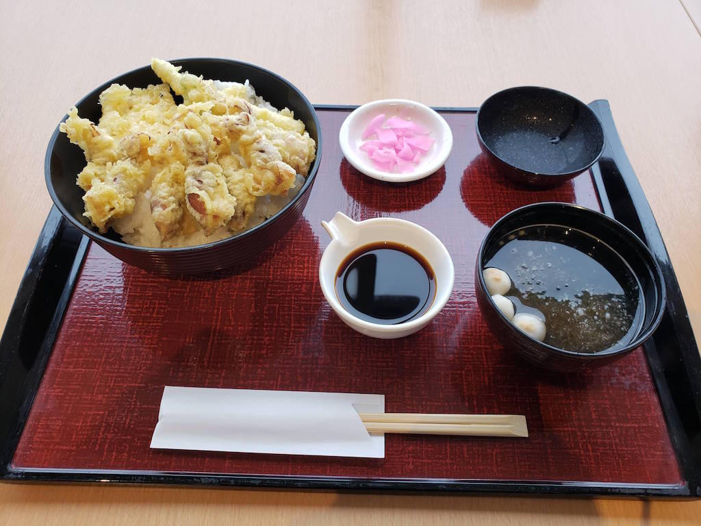 展望レストランでホタルイカの天丼をいただく