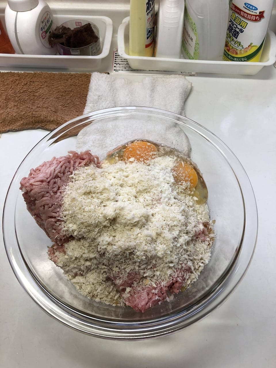 飴色に炒めて粗熱取った玉ねぎひき肉パン粉卵牛乳塩胡椒を混ぜる