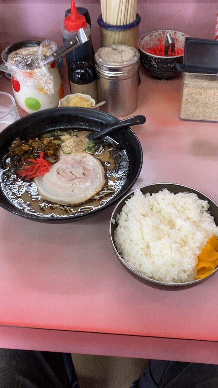 焦がしニンニクネギ油をかけた黒豚骨にライス大、替え玉1回やって780円と言う安さ!