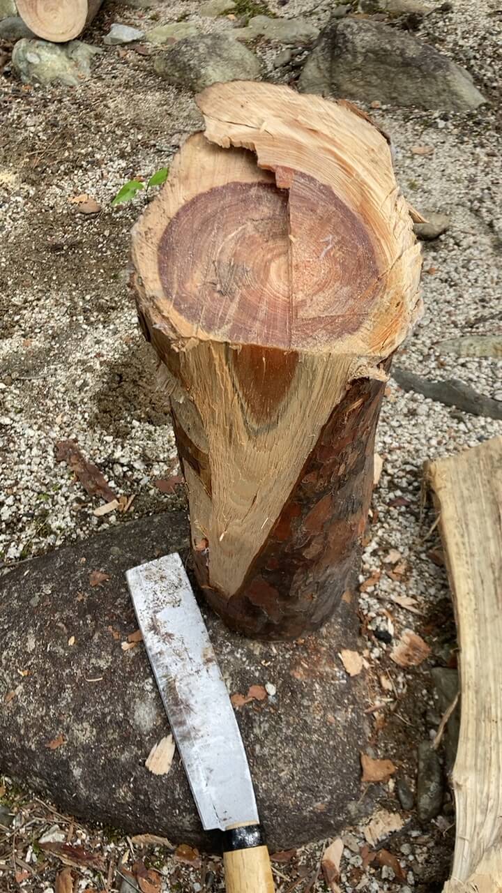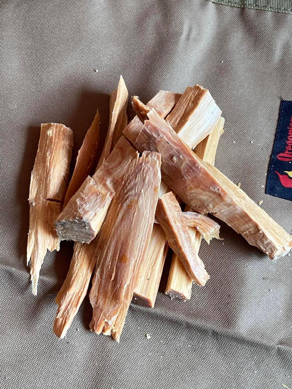 ファットウッドは枯れて年数が経った枝(倒木でボロボロに朽ち果てた幹なら尚良し)の根本に溜まるので薪用の松にはあまりないかもしれないです