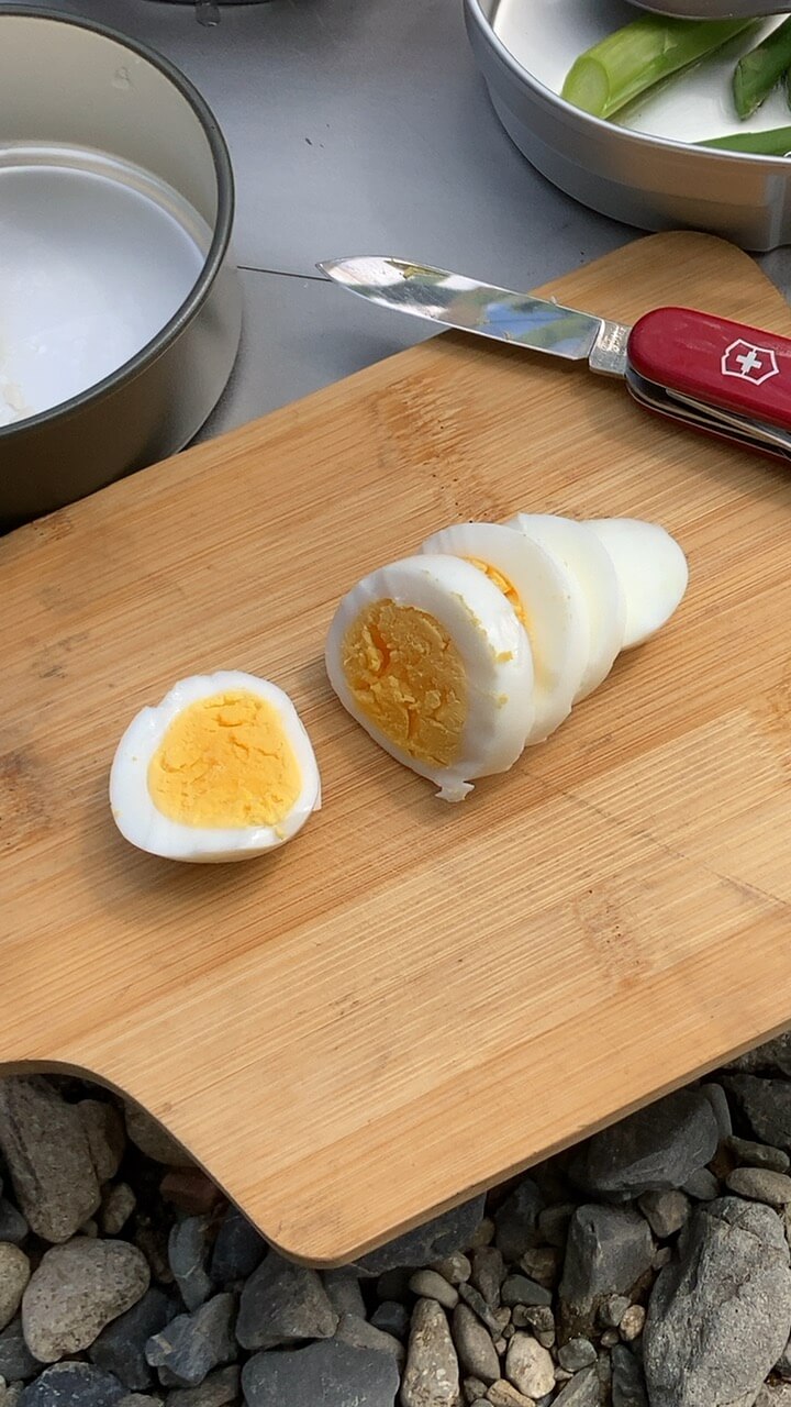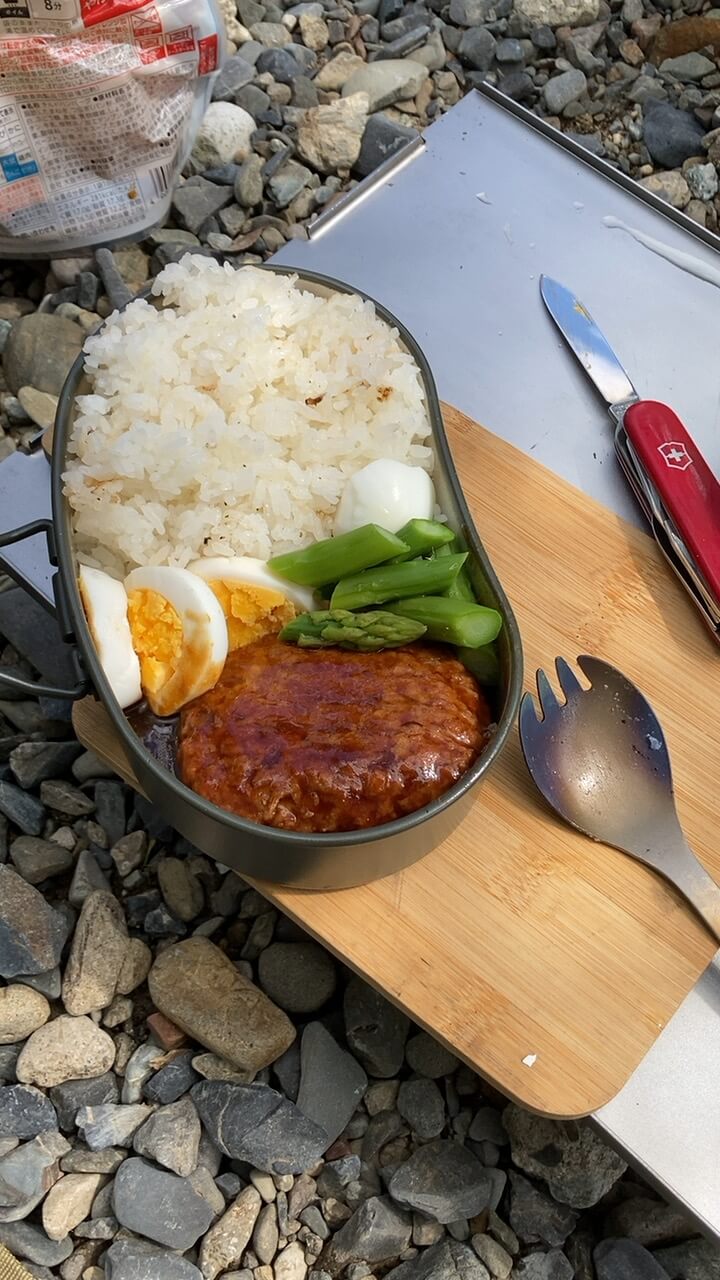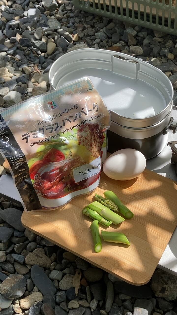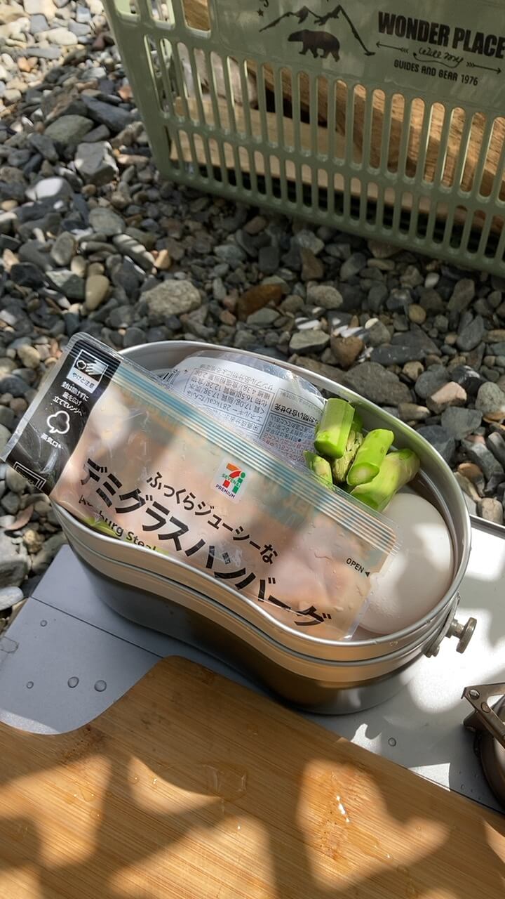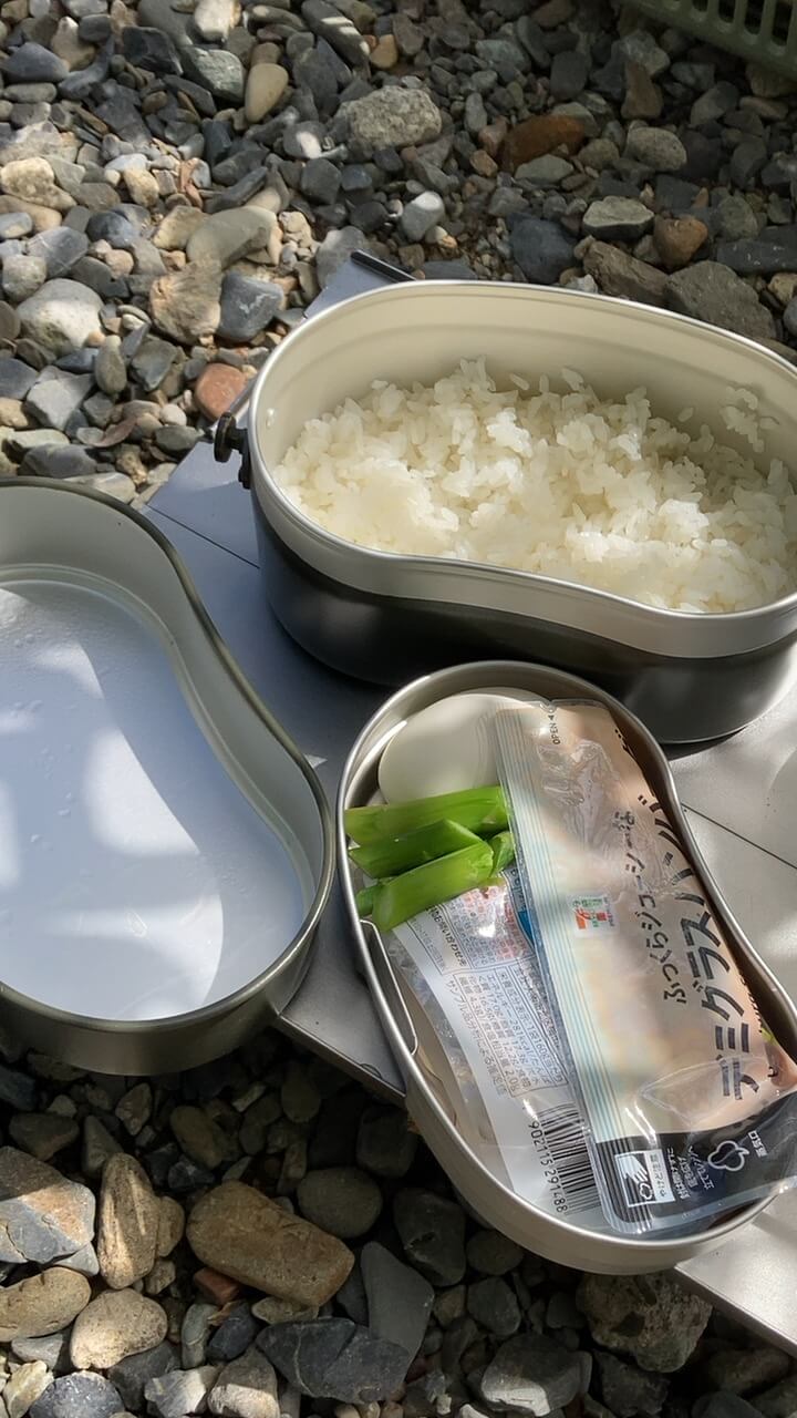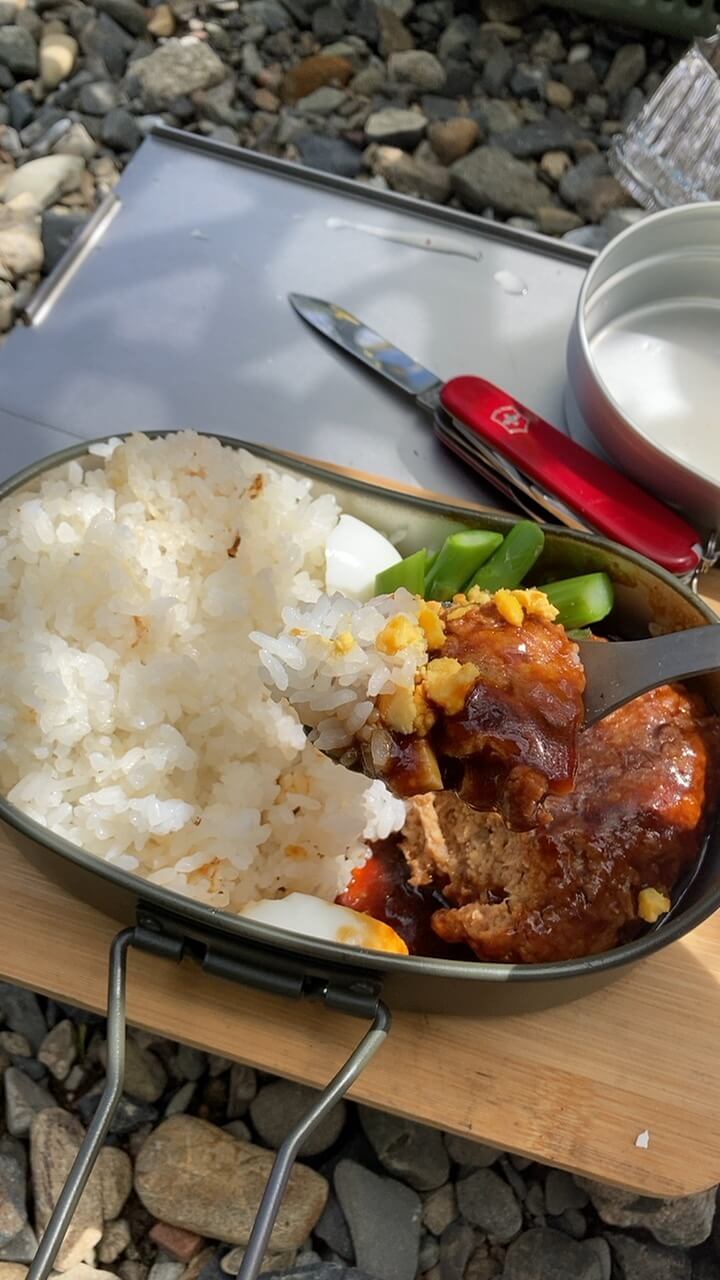 飯盒の中子を利用して炊飯の熱でハンバーグを湯煎しながら茹で卵を作ります
