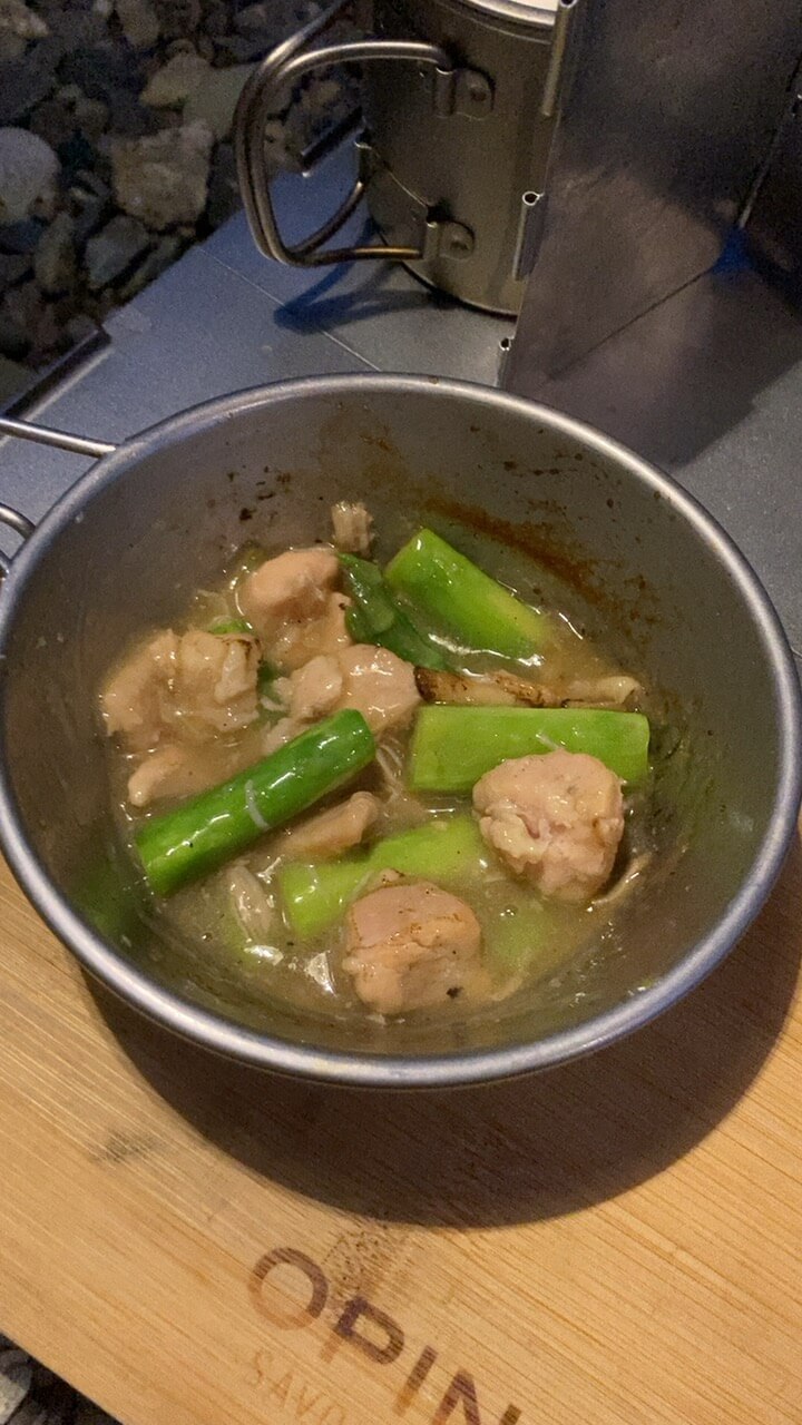 アスパラと焼き鳥の塩ニンニク炒めの完成!