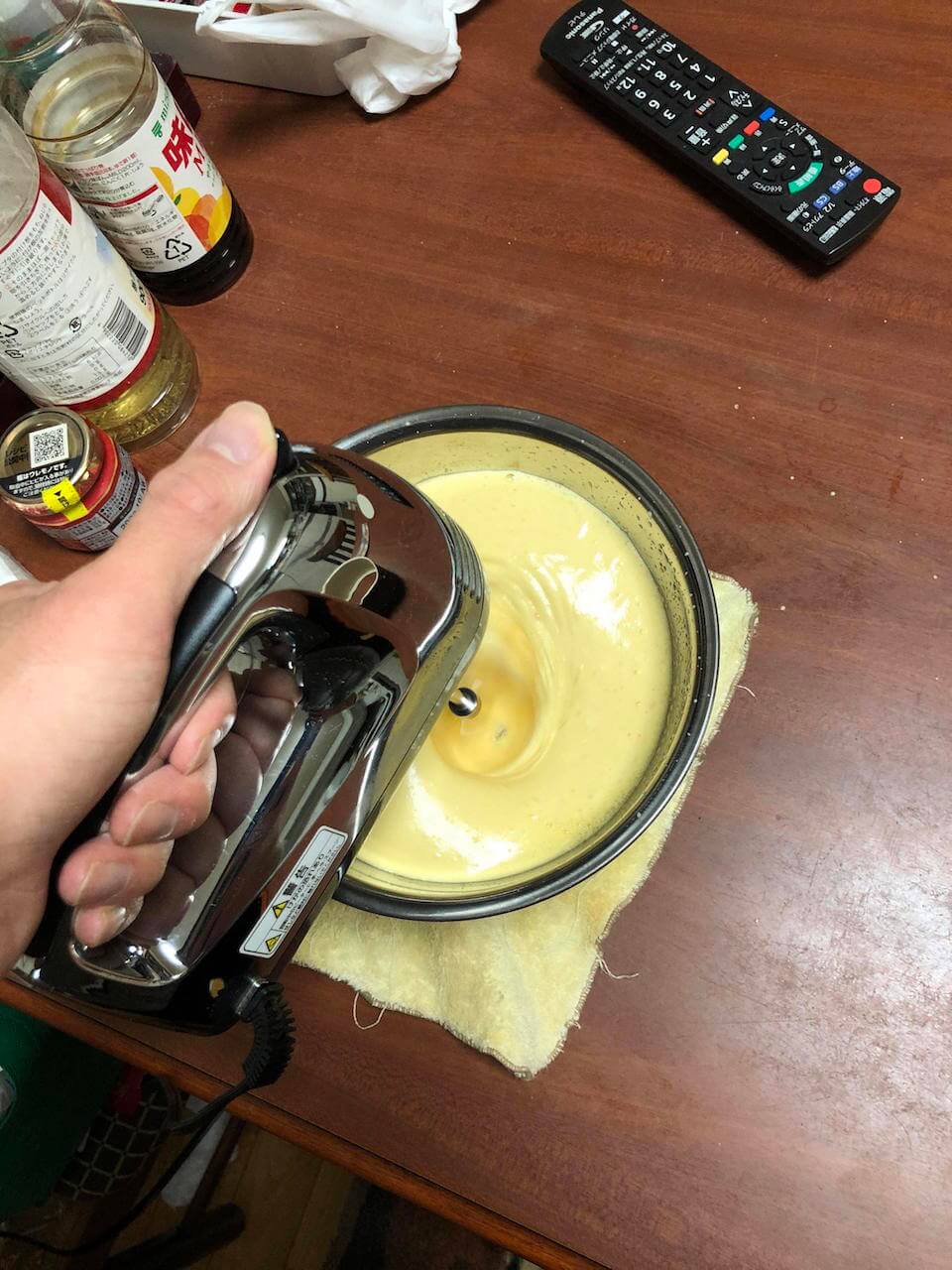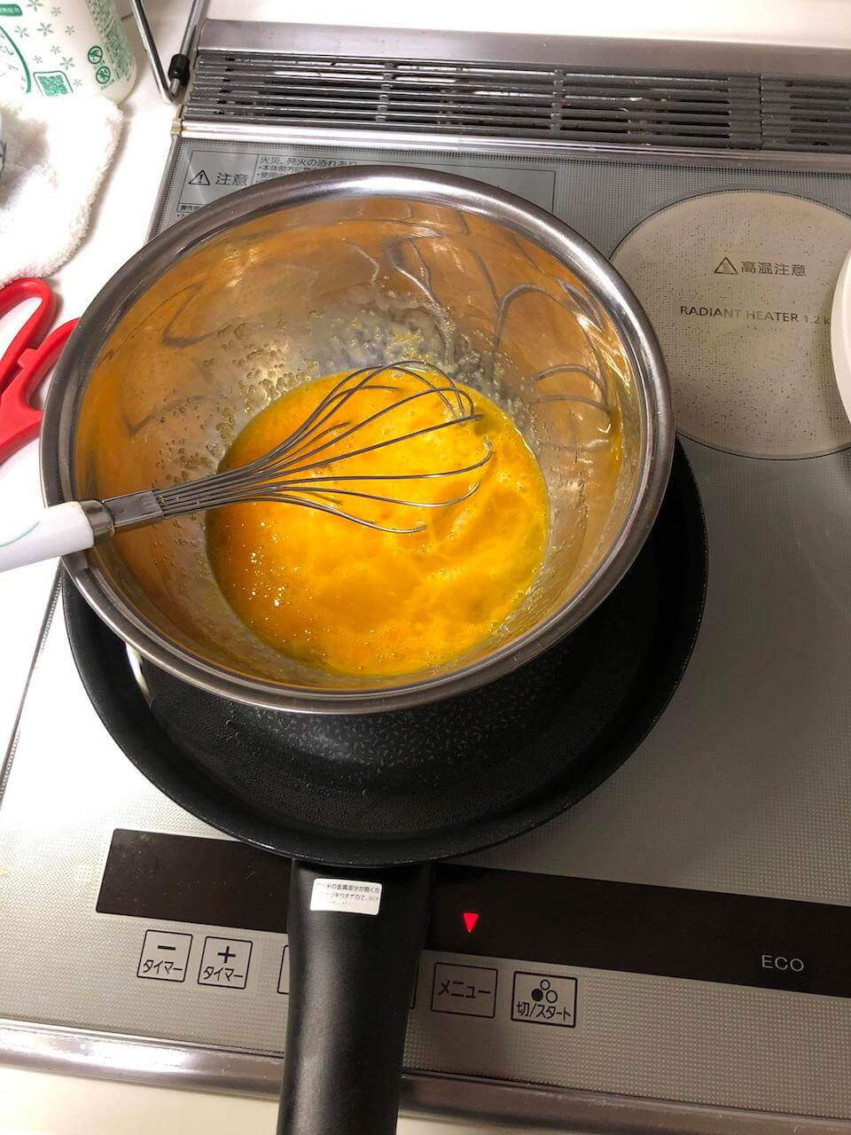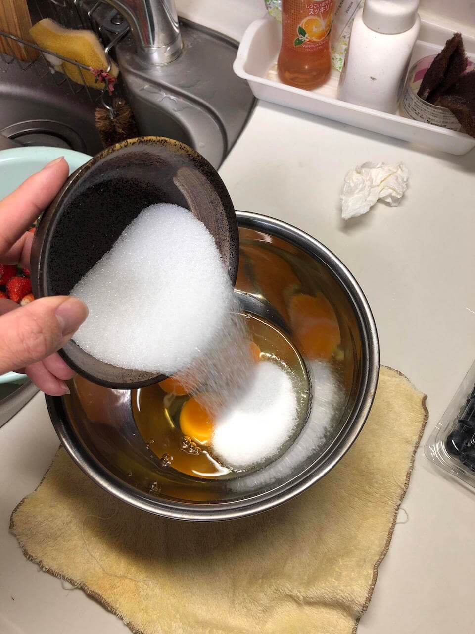 卵3つに砂糖を混ぜて泡立てていく