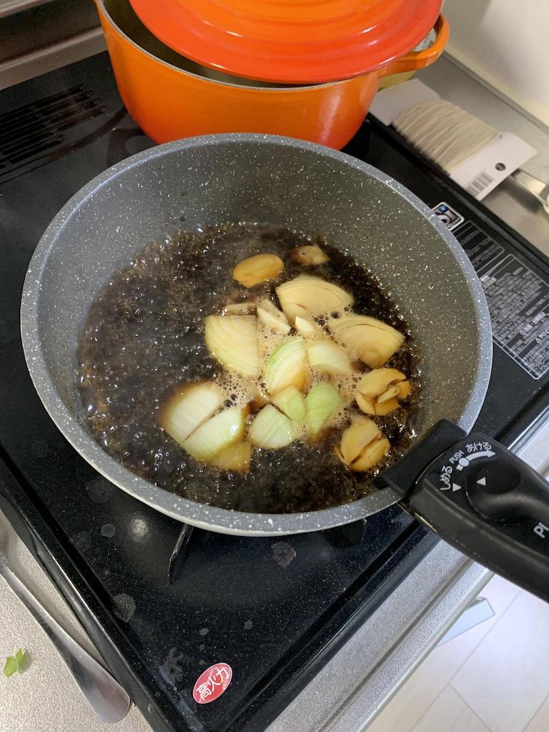 玉ねぎニンニクぶち込んでアルコールを飛ばしがてら沸騰させるで