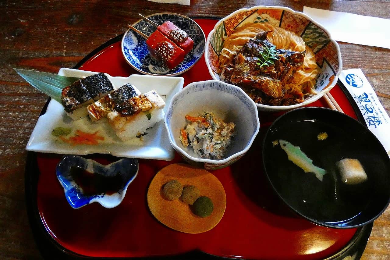 滋賀の名産、焼き鯖寿司・赤こんにゃくのセットを頂きます