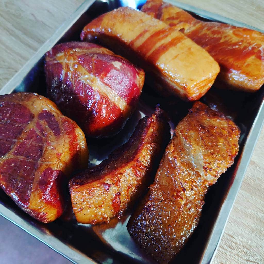 あと家系ラーメンのレアチャーシュー食べたくて豚肩ロースも燻製してみたけど温度管理ムズいわね