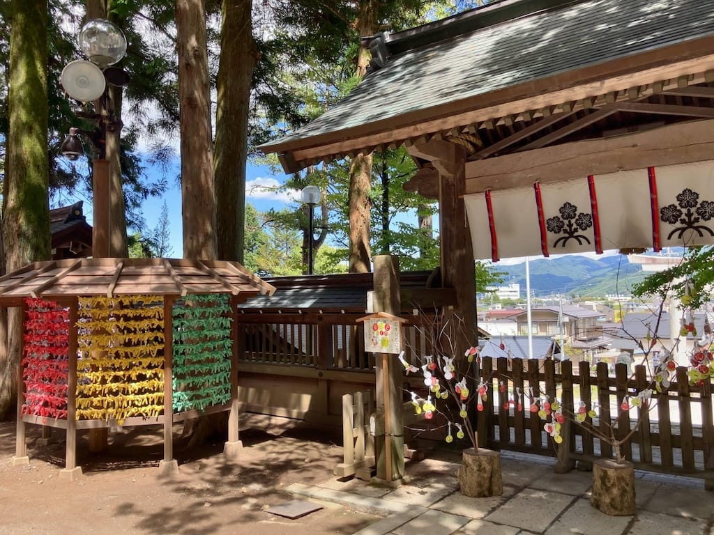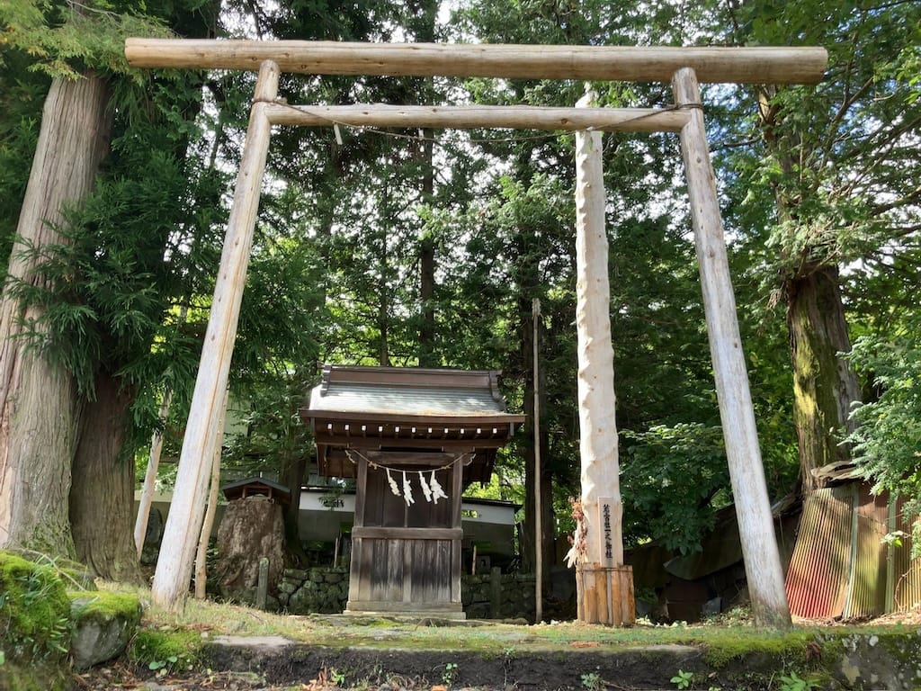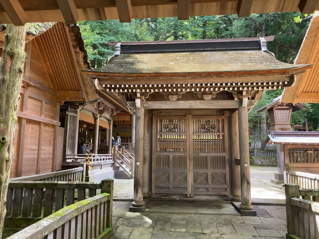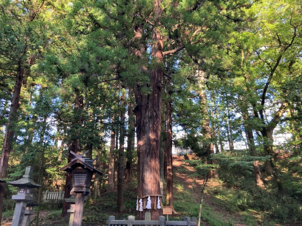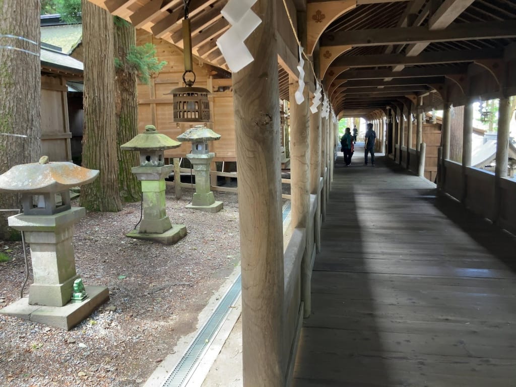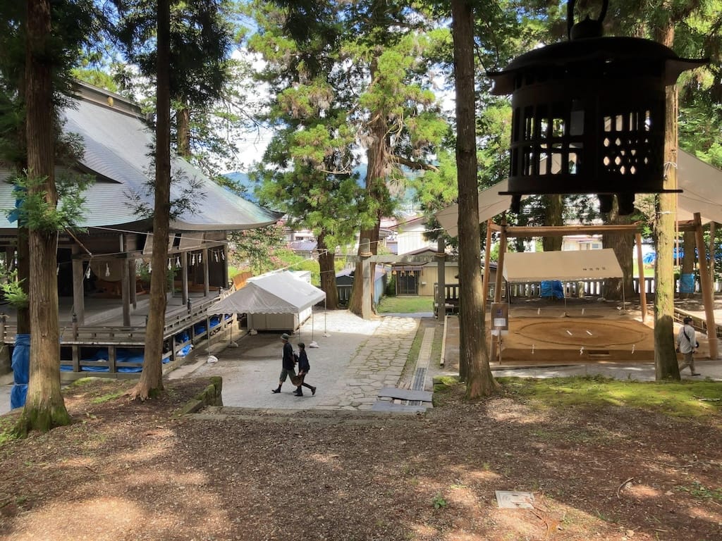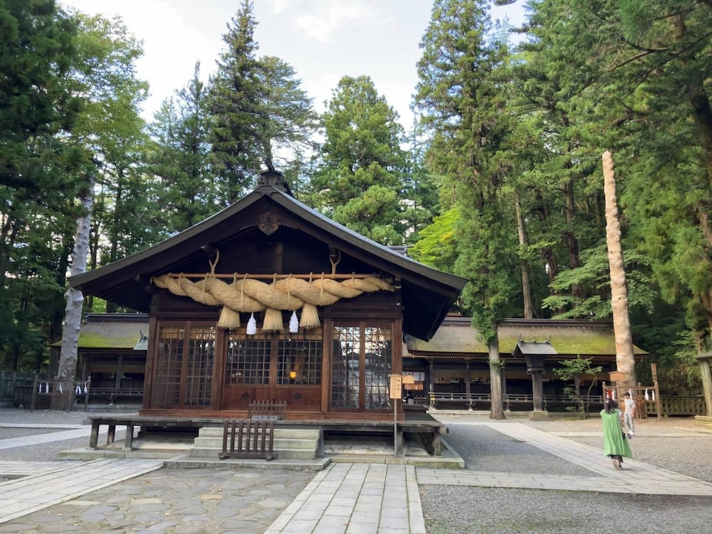境内の四隅に御柱が建てられてて、7年に一度の御柱祭りで建て替えられるらしい